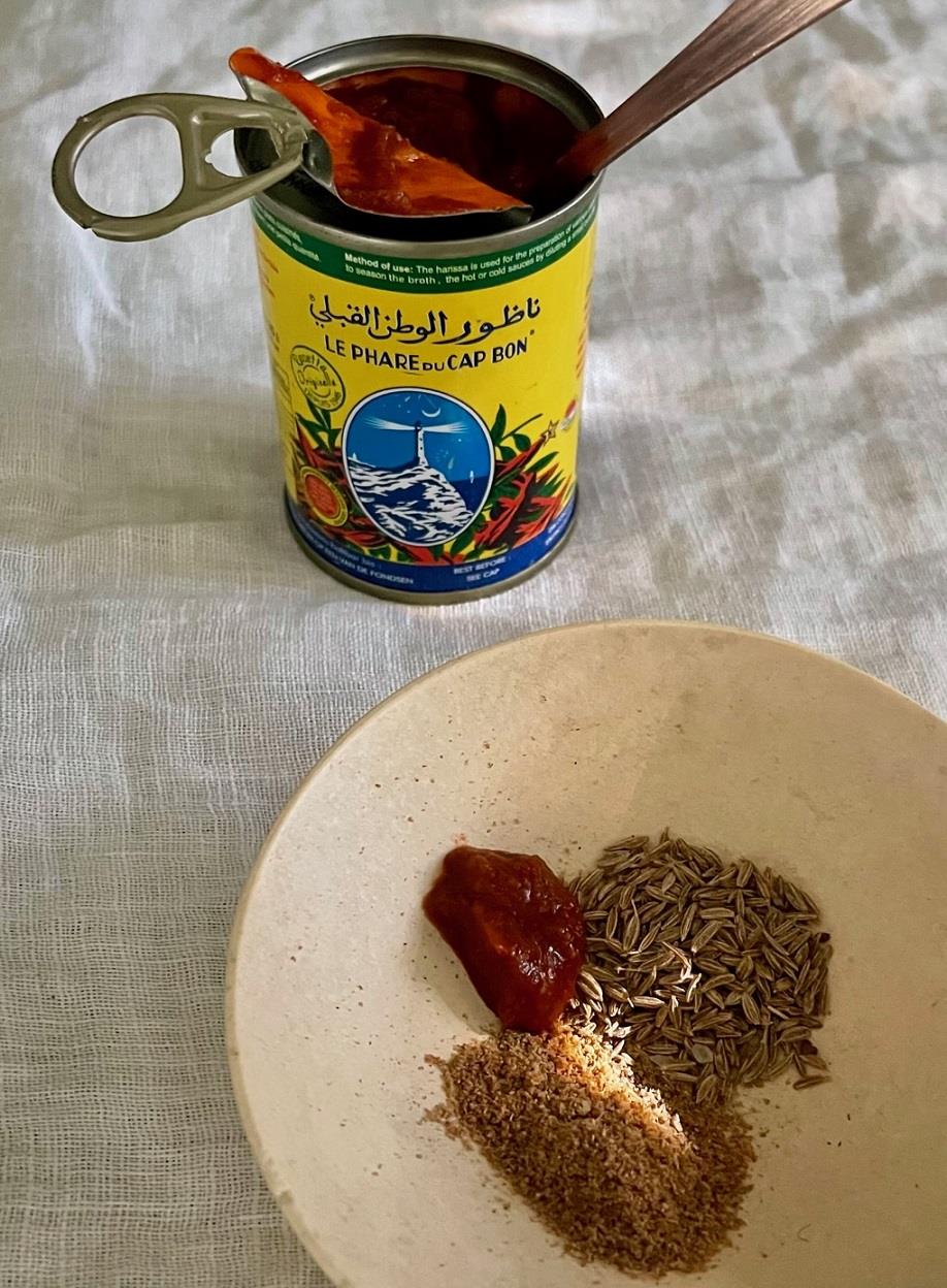 Ζεσταίνουμε λίγο εξαιρετικό παρθένο ελαιόλαδο σε ένα βαθύ τηγάνι και σοτάρουμε ένα μέτριο κρεμμύδι κομμένο σε λεπτά μισοφέγγαρα. Το βοηθάμε με λίγο αλάτι και ελάχιστο νερό για να μαλακώσει χωρίς να πάρει χρώμα. Μόλις είναι έτοιμο προσθέτουμε τα μπαχαρικά: 1 κ.γλ. σπόρους κύμινο, 1 κ.γλ. ξερό κόλιανδρο και 1 κοφτό κ.γλ. harissa ή λίγο περισσότερη για πιο καυτερή γεύση (βλ. tips). Μόλις μυρίσουν τα μπαχαρικά προσθέτουμε τους κύβους των λαχανικών και μαγειρεύουμε σε μέτρια φωτιά για λίγο, φροντίζοντας να μείνουν οι ντομάτες σχετικά «ζωντανές». Επειδή ενδέχεται να έχουν μείνει αρκετά υγρά, βάζουμε τη σαλάτα στο μπολ του σερβιρίσματος με τρυπητή κουτάλα αφήνοντας, πάντως, και λίγο ζουμάκι που έχει όλα τα αρώματα των μπαχαρικών και είναι ιδανικό για τις γνωστές και λατρεμένες βούτες. Μόλις η σαλάτα χλιάνει την πασπαλίζουμε με φυλλαράκια φρέσκου κόλιανδρου (ή μαϊντανού για όσους δεν συμπαθούν τον κόλιανδρο, με διαφορετικό αποτέλεσμα, βεβαίως). Απολαμβάνουμε τη σαλάτα χλιαρή ή σε θερμοκρασία δωματίου. Συνοδεύουμε με αραβικές πίτες.