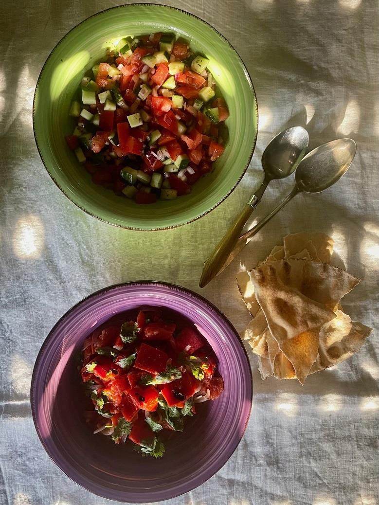 Σε αντίθεση με την Ελλάδα, στην Ανατολή συνηθίζεται πολύ ο συνδυασμός ντομάτας-λεμονιού (δείτε εδώ τη συνταγή της καταπληκτικής Λιβανέζικης σαλάτας fattoush). Η σημερινή σαλάτα κατάγεται από την Περσία και ονομάζεται Shirazi από την πόλη Shiraz του νοτιοδυτικού Ιράν. Στην παραδοσιακή της μορφή αντί λεμονιού χρησιμοποιούν αγουρίδα δηλ. χυμό από άγουρα σταφύλια, ένα υλικό που το γνωρίζουν πολύ καλά στην Κρήτη και μάλιστα το αποκαλούν λεμόνι του καλοκαιριού, μιας και τα λεμόνια είναι δυσεύρετα το καλοκαίρι (ή ήταν δυσεύρετα, αφού σήμερα βρίσκουμε λεμόνια όλον τον χρόνο κι ας είναι εισαγωγής…). Περιηγούμενη στο διαδίκτυο, είδα ότι ένα γνωστό και πολύ καλό Κρητικό οινοποιείο, αυτό του Λυραράκη, εμφιαλώνει αγουρίδα αλλά ακόμη δεν έχω ψάξει να βρω πού το πωλούν κι έτσι στη σαλάτα έβαλα λεμόνι.
