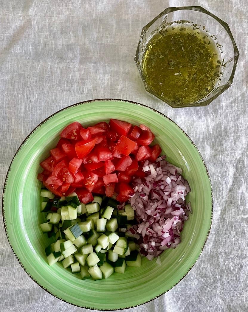 Το πλέον σημαντικό στοιχείο είναι το κόψιμο των λαχανικών σε όσο μικρότερους κύβους είναι δυνατόν. Οι ντομάτες και τα αγγούρια είναι σε λίγο μεγαλύτερη ποσότητα από το κρεμμύδι: για 2 μέτριες ντομάτες και ένα μεγάλο αγγούρι, υπολογίζουμε 1 μικρό σχετικά κρεμμύδι. Μπορούμε να ξεφλουδίσουμε τις ντομάτες αλλά δεν είναι απαραίτητο, αρκεί να είναι ψιλόφλουδες, καλό όμως είναι να απομακρύνουμε τα πολλά σπόρια. Εάν το αγγούρι έχει σπόρια, το κόβουμε περιμετρικά από το κέντρο σε λωρίδες. Προσωπικά δεν ξεφλουδίζω ποτέ τα αγγούρια.