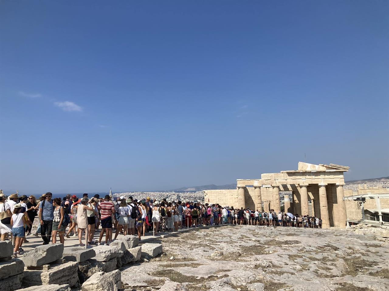 Αναμονή που ξεπερνά (ενίοτε κατά πολύ) την μία ώρα κάτω από τον καυτό αθηναϊκό ήλιο, εκτιμήσεις που μιλούν ακόμα και για 23.000 επισκέπτες την ημέρα, φωτογραφίες με συνωστισμό που θυμίζει Glastonbury στις δόξες του. Πώς έφτασε ο υπερτουρισμός στην Ακρόπολη να γίνει πρώτο θέμα στα διεθνή μέσα ενημέρωσης, τη στιγμή μάλιστα που τα νούμερα του τουρισμού στην Ελλάδα φέτος δεν ήταν καθόλου αυτά που θέλαμε;