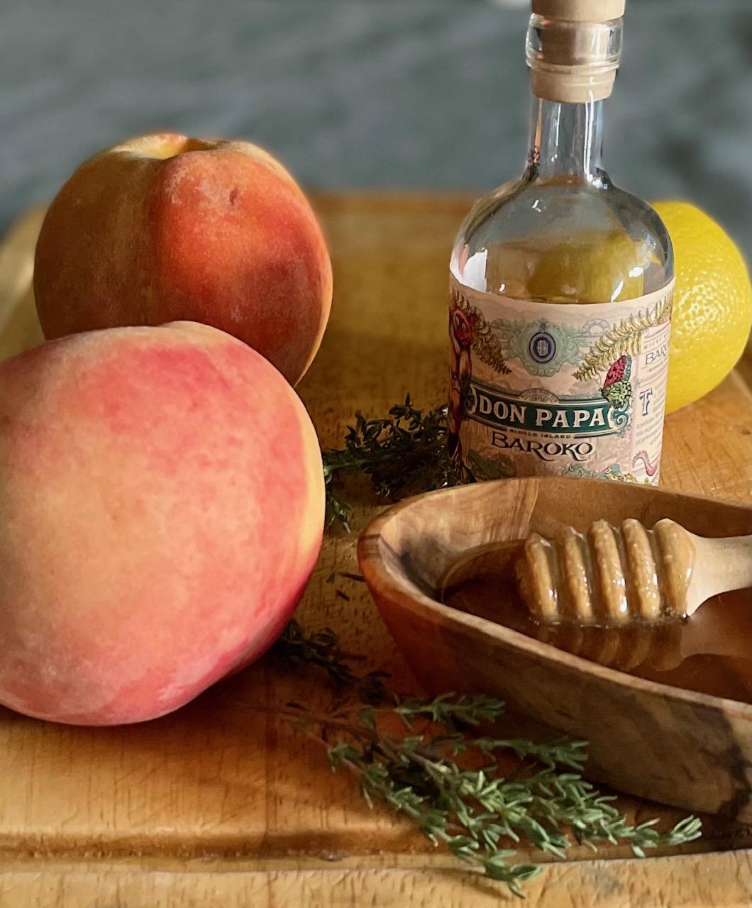 Ροδάκινα: Πλένουμε 2 ροδάκινα, τα κόβουμε στη μέση και κάθε μισό σε κυδωνάτες φέτες. Τις βάζουμε σε πυρίμαχο σκεύος, αφού πρώτα το βουτυρώσουμε ελαφρά. Περιχύνουμε με 2 κ.σ. θυμαρίσιο μέλι, 1 σφηνάκι ρούμι και τον χυμό από μισό λεμόνι. Πασπαλίζουμε με φυλλαράκια φρέσκου θυμαριού και ανακατεύουμε. Βάζουμε στον φούρνο. Μετά τα πρώτα 20’ θα δούμε ότι τα ροδάκινα θα έχουν αρχίσει να βγάζουν τους χυμούς τους και να μαλακώνουν.