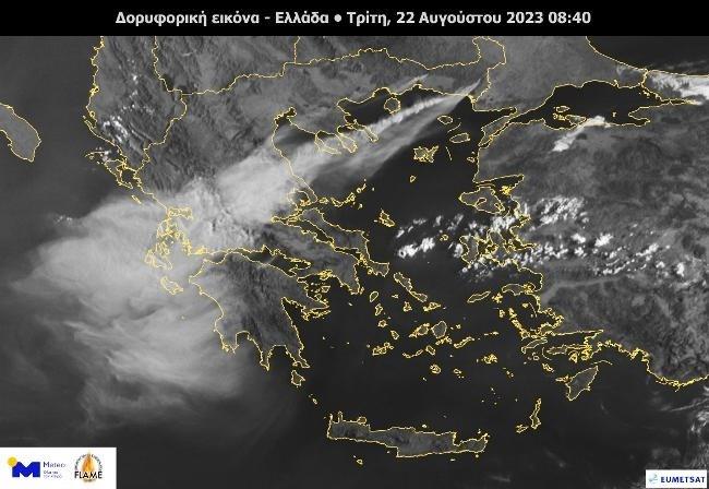 Όπως αναφέρει το METEO, διακρίνεται η μεταφορά του καπνού πάνω από το Βόρειο και Κεντρικό Αιγαίο από τις δασικές πυρκαγιές σε Έβρο και Ροδόπη, καθώς και από την πυρκαγιά πάνω από τη Βοιωτία.