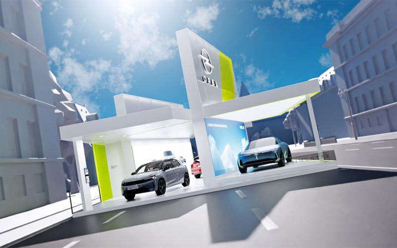 Η “Bold & Pure” σχεδιαστική φιλοσοφία της Opel κυριαρχεί και στα δύο περίπτερα. Ημιδιαφανή υλικά και μεγάλες οθόνες καλωσορίζουν το κοινό και συμβολίζουν την εξέλιξη της εταιρικής ταυτότητας της μάρκας. Οι χρωματισμοί, τα υλικά και οι υφές εναρμονίζονται με το Experimental concept. Επιπλέον, οι οθόνες προσφέρουν μια διαδραστική ψηφιακή εμπειρία στους επισκέπτες. Χρησιμοποιώντας το Opel AI – τεχνητή νοημοσύνη για την παραγωγή εικόνας, που αναπτύχθηκε ειδικά για την Opel – και ένα ειδικό τερματικό που βρίσκεται στο περίπτερο, μπορούν να δημιουργήσουν διάφορα backgrounds για την οθόνη πίσω από το concept car. Στη συνέχεια, μπορούν να κατεβάσουν την εικόνα μέσω κωδικού QR στο smartphone τους και να τη μοιραστούν στα μέσα κοινωνικής δικτύωσης.