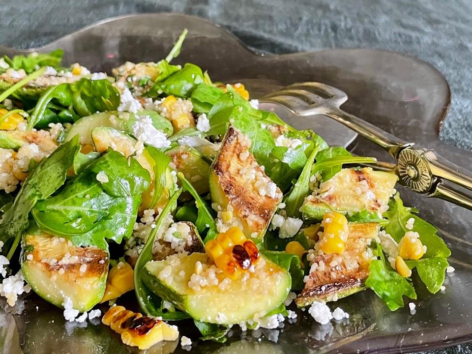 Ζεματάμε σε αλατισμένο νερό ένα καλαμπόκι για λίγα λεπτά. Το στραγγίζουμε και το σκουπίζουμε με απορροφητικό χαρτί. Πλένουμε και σκουπίζουμε 8 μετρίου μεγέθους κολοκυθάκια, τα κόβουμε στα δύο κατά μήκος και τα αλατοπιπερώνουμε. Ζεσταίνουμε καλά ένα σχαροτήγανο, προσθέτουμε ελάχιστο ελαιόλαδο και ψήνουμε τα κολοκυθάκια μέχρι να αρπάξουν λίγο και να μαλακώσουν, όχι όμως πολύ, δηλ. να τρυπιούνται μέχρι μέσα αλλά να παραμείνουν τραγανά. Τα αφαιρούμε από το σκεύος και στη θέση τους βάζουμε το καλαμπόκι. Το ψήνουμε γυρνώντας το από όλες τις πλευρές μέχρι να «αρπάξει» κατά τόπους. Μόλις κρυώσουν τα λαχανικά κόβουμε τα κολοκυθάκια σε μικρά κομμάτια μεγέθους μπουκιάς και χωρίζουμε τους κόκκους από το καλαμπόκι. Βάζουμε τα λαχανικά σε μεγάλο μπολ. Προσθέτουμε φύλλα ρόκας, λευκό τυρί της αρεσκείας μας (ξινομυζήθρα, φέτα, ανθότυρο, γαλομυζήθρα, τσαλαφούτι, κατίκι, κλπ) και 2 χούφτες μαγειρεμένο κουσκούς, πλιγούρι ή τραχανά.