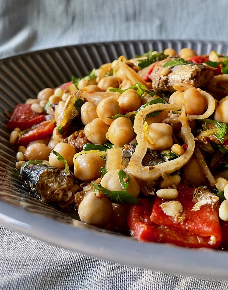 Σε ένα μπολ βάζουμε ξιδάτες πιπεριές Φλωρίνης κομμένες σε μικρά κομμάτια και λίγο από το ζουμί τους, κρεμμύδι κομμένο σε λεπτά μισοφέγγαρα (ή πίκλες – δείτε τη συνταγή πιο πάνω), ξύσμα και χυμό λεμονιού, ρεβίθια, γλυκιά ή καπνιστή πάπρικα, ψιλοκομμένο μαϊντανό, αλατοπίπερο και εξαιρετικό παρθένο ελαιόλαδο (αν οι σαρδέλες που έχετε είναι σε τέτοιο λάδι, χρησιμοποιήστε το, αλλιώς θα τις στραγγίσετε καλά και θα βάλετε το δικό σας ελαιόλαδο). Ανακατεύουμε καλά. Προσθέτουμε τις σαρδέλες (εάν είναι μεγάλες τις κόβουμε σε μικρότερα κομμάτια-μπουκιές) κι ανακατεύουμε απαλά για να μην διαλυθούν. Πασπαλίζουμε με καβουρδισμένους κουκουναρόσπορους και σερβίρουμε.