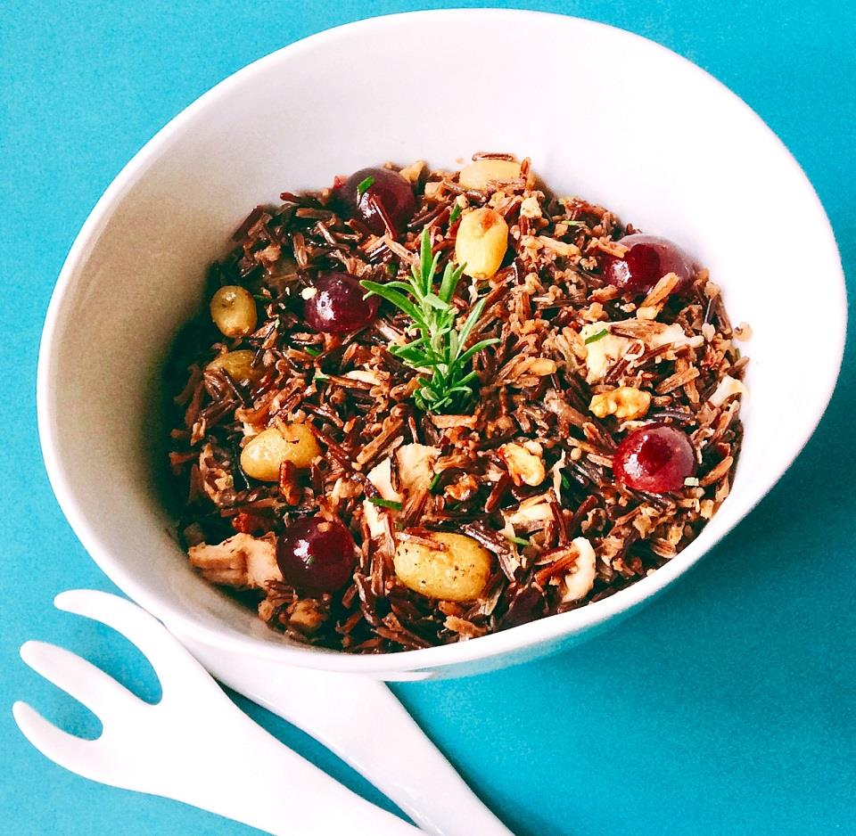 Φέρνουμε σε βρασμό άφθονο αλατισμένο νερό, προσθέτουμε 200 γρ. άγριο ρύζι, χαμηλώνουμε την φωτιά σε μέτρια, μισοσκεπάζουμε το σκεύος και βράζουμε για αρκετή ώρα, περίπου 40΄- 45΄ (βλ. tips). Το σουρώνουμε και το λαδώνουμε ελαφρώς. Συγχρόνως πλένουμε ένα μεγάλο τσαμπί σουλτανίνα. Χωρίζουμε τις ρώγες, τις βάζουμε σε ένα μπολ και τις αλείφουμε με λίγο ελαιόλαδο (ίσα ίσα να γυαλίσουν), και 1 κ.σ. πετιμέζι ή μέλι. Ανακατεύουμε καλά με τα χέρια μας και τοποθετούμε τις ρώγες σε μονή στρώση στη λαμαρίνα του φούρνου που έχουμε στρώσει με λαδόκολλα. Πασπαλίζουμε με άνθος αλατιού και μπόλικο μαύρο πιπέρι, τριμμένο στην χοντρή σκάλα του μύλου. Ενδιάμεσα τοποθετούμε κλαράκια φρέσκου δενδρολίβανου και 1 μεγάλο κρεμμύδι κομμένο σε λεπτά μισοφέγγαρα. Ψήνουμε σε προθερμασμένο φούρνο στους 180ο C στη λειτουργία του αέρα για περίπου 30΄-40΄, μέχρι οι ρώγες του σταφυλιού να πάρουν χρώμα και να καραμελώσει το κρεμμύδι. Σε ένα τηγάνι καβουρδίζουμε ελαφρά σε μέτρια φωτιά, 1 μεγάλη χούφτα χοντροκομμένα καρύδια. Σε ένα μεγάλο μπολ βάζουμε το ρύζι, τα περισσότερα σταφύλια (κρατάμε λίγα για το ντεκόρ) και τα κρεμμύδια (πετάμε το δενδρολίβανο), τα καβουρδισμένα καρύδια και 1 στήθος ψητού κοτόπουλου κομμένο σε κύβους. Ετοιμάζουμε την vinaigrette με το ζουμί που έβγαλαν τα σταφύλια στο ψήσιμο, 1 κ.σ. ξύδι από κόκκινο ή λευκό κρασί, εξαιρετικό παρθένο ελαιόλαδο, 1 κλαράκι ψιλοκομμένο φρέσκο δενδρολίβανο και αλατοπίπερο. Ανακατεύουμε καλά τα υλικά με την vinaigrette και στολίζουμε με τα ψητά σταφύλια που κρατήσαμε, λίγες ρώγες ωμού μαύρου ή ροζ σταφυλιού κομμένες στη μέση και ξεκουκουτσιασμένες και ένα κλαράκι δενδρολίβανο. Απολαμβάνουμε σε θερμοκρασία δωματίου.