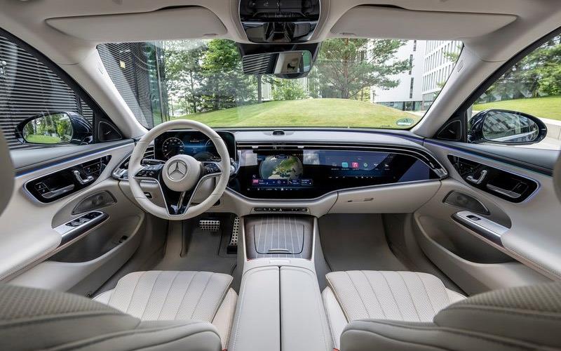 Ο πίνακας οργάνων είναι η επιτομή της ψηφιακής εμπειρίας στο εσωτερικό. Εάν η E-Class διαθέτει την προαιρετική οθόνη συνοδηγού, η μεγάλη γυάλινη επιφάνεια της MBUX Superscreen επεκτείνεται έως την κεντρική οθόνη. Οπτικά αποκομμένη από αυτή ξεχωρίζει η οθόνη οδηγού που βρίσκεται στο οπτικό του πεδίο. Τα μοντέλα χωρίς οθόνη συνοδηγού διαθέτουν ένα μεγάλο διακοσμητικό στοιχείο που εκτείνεται στο κέντρο. Η κεντρική οθόνη φαίνεται να αιωρείται πάνω από την κοίλη επιφάνεια αυτού του διακοσμητικού στοιχείου.