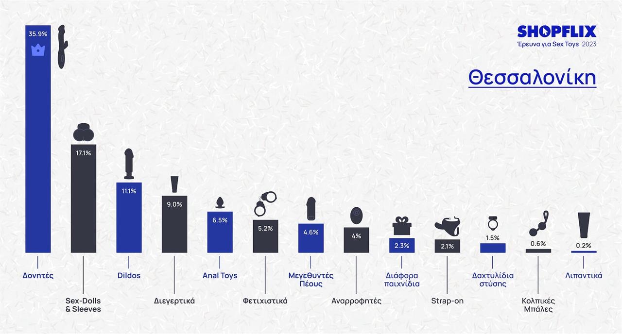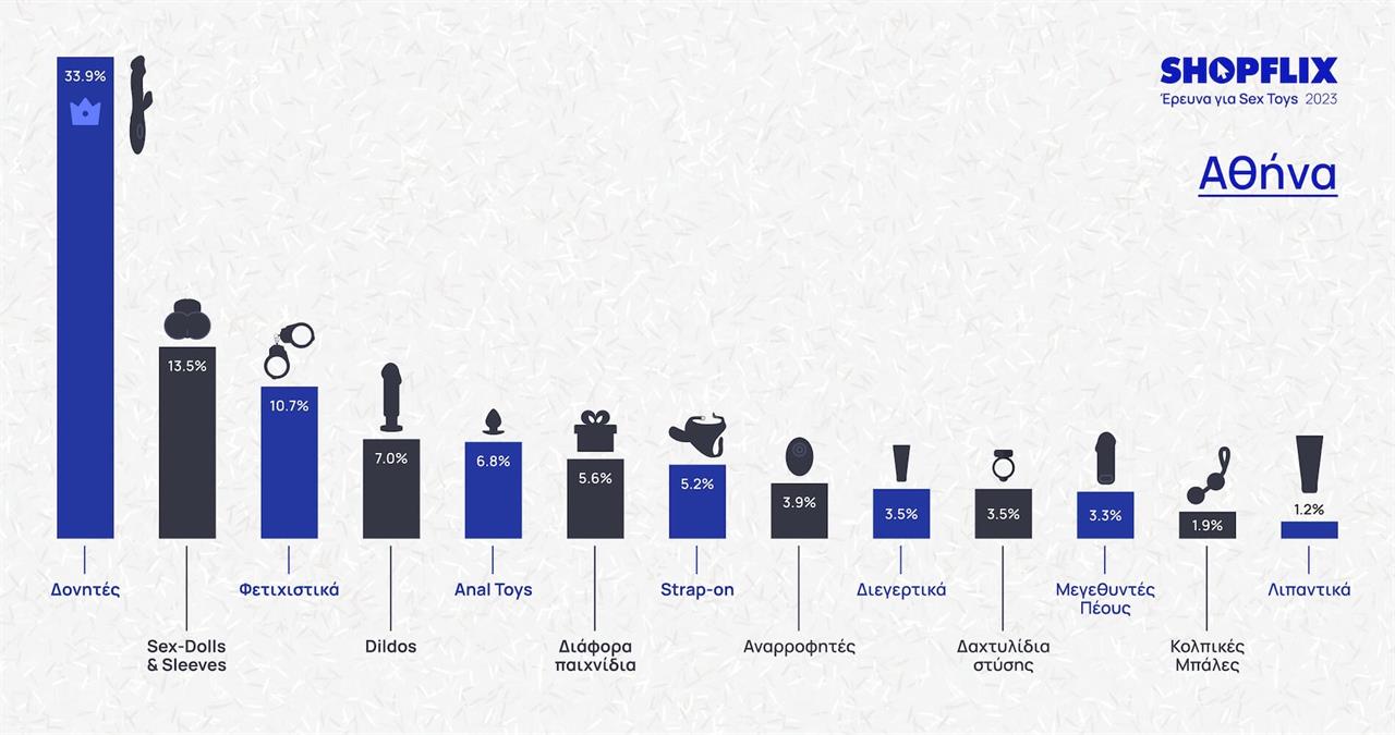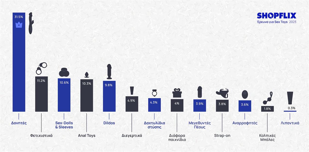 Την πρωτιά στις προτιμήσεις των Ελλήνων έχουν οι δονητές, και μάλιστα με μεγάλη διαφορά από την δεύτερη θέση, που ανήκει στα φετιχιστικά παιχνίδια (μαστίγια, nipple clamps, χειροπέδες και δε συμμαζεύεται). Την πεντάδα συμπληρώνουν οι sex dolls, τα anal toys και τα dildos.