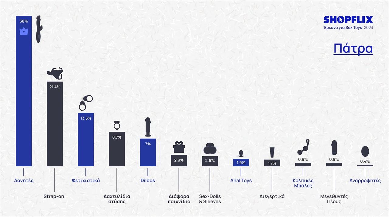 Άλλα sex toys προτιμάμε στην Αθήνα και άλλα στη Θεσσαλονίκη. Η δε Πάτρα πρωτοπορεί, με τα strap on στη δεύτερη θέση του top10.