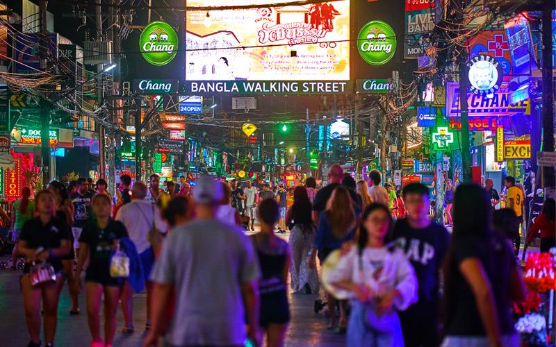 Η Bangla Road ζωντανεύει μετά τη δύση του ηλίου, όταν ο δρόμος κλείνει για τα οχήματα, γεμίζει με εκατοντάδες κόσμου και μεταμορφώνεται σε ένα υπαίθριο φεστιβάλ 400 μέτρων με φώτα νέον που φέρνουν στο νου το Chunking Express του Γουόνγκ Καρ Βάι, δυνατή μουσική και φθηνή μπύρα στα 2-3 ευρώ το ποτήρι.