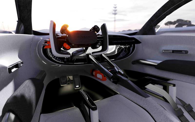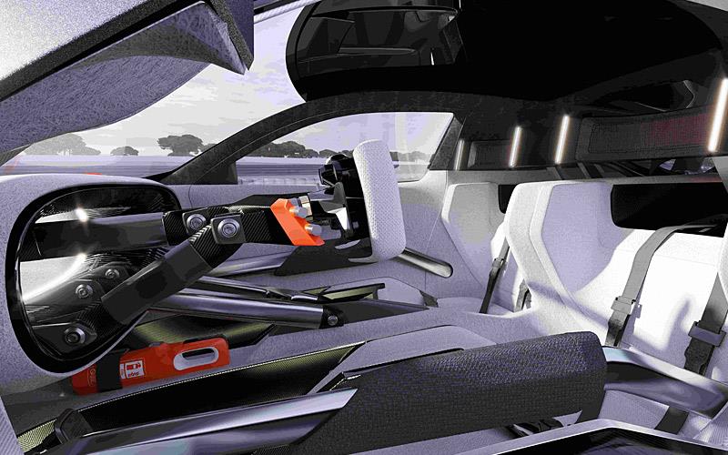 Ανάμεσα στους δύο επιβάτες, δύο μεταλλικές δοκοί συγκρατούν την κεντρική κονσόλα στη θέση της και βιδώνονται στη «ράχη» του αυτοκινήτου που φαίνεται από το πάτωμα. Κάτω από τις δύο ράβδους στήριξης, είναι τοποθετημένος ένας πυροσβεστήρας. Το εσωτερικό είναι μια φουτουριστική ερμηνεία της γυμνής λειτουργικότητας ενός αγωνιστικού αυτοκινήτου, με μερικές μόνο οθόνες που εμφανίζουν βασικές πληροφορίες με ελάχιστους περισπασμούς οι οποίες παραπέμπουν στις ρυθμίσεις διαδικτυακών προσομοιωτών αγώνων.