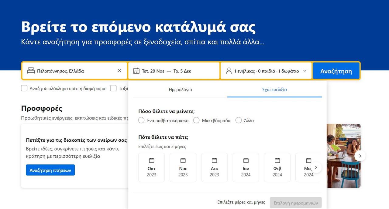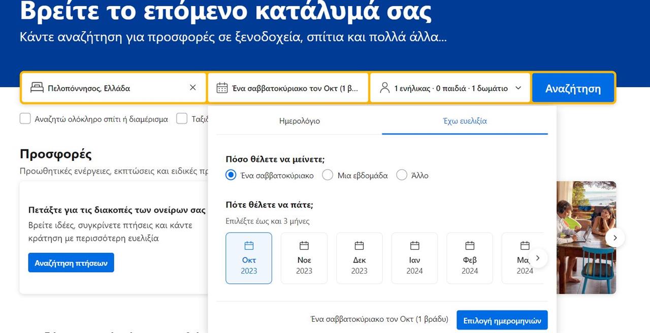 Πατάς Έχω Ευελιξία, και μετά διαλέγεις «ένα Σαββατοκύριακο» (ή εκεί που λέει Άλλο αν τα ρεπό σου είναι αλλοπρόσαλλα) διαλέγεις από έναν έως και τρεις μήνες και πατάς Επιλογή Ημερομηνιών. Κλείνει αυτόματα αυτό το παράθυρο, και πατάς Αναζήτηση.