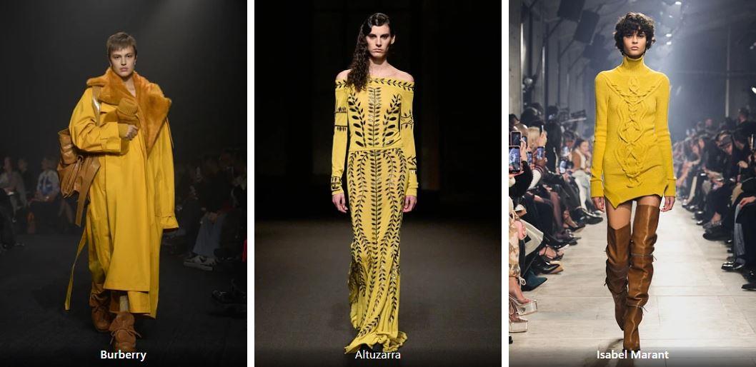 Το κίτρινο θα είναι ο αδιαμφισβήτητος πρωταγωνιστής της σεζόν. Αυτό το χρώμα, που συνδέεται με τη ζεστασιά και τη ζωντάνια του ήλιου, κερδίζει ολοένα και περισσότερο χώρο στην πασαρέλα, και γίνεται τάση που θα διαρκέσει στο χρόνο. Η απόχρωση του κίτρινου που προτείνει η Pantone για την κρύα εποχή είναι η High Visibility, που χαρακτηρίζεται από έντονη φωτεινότητα. Εκπέμποντας τη ζεστασιά και τη λάμψη του ήλιου, εκφράζει τη χαρά και την καλή διάθεση.