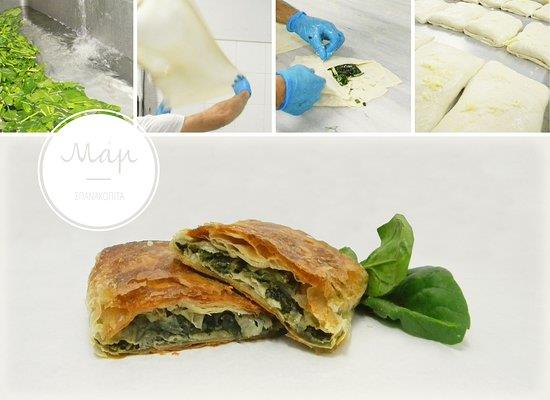 Φύλλο αέρος σε στρώσεις ή χορταστική ζύμη κουρού. Γέμιση καμωμένη με μεράκι, με φρέσκο σπανάκι και κάθε λογής βότανα – αναλόγως τη συνταγή. Γεύση και αξία ανεκτίμητη.