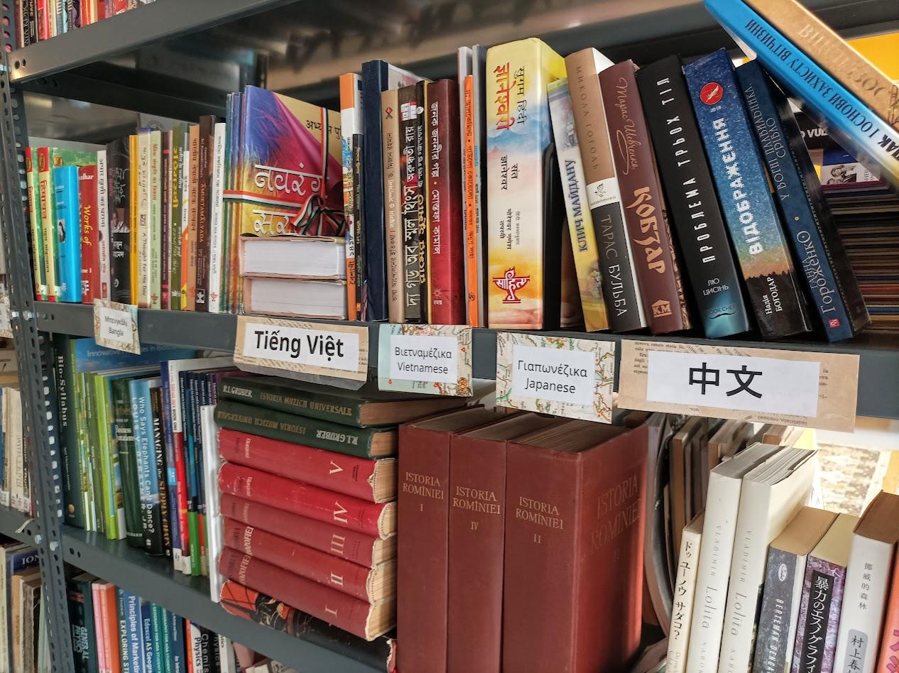 «Οι γλώσσες είναι συνολικά 56» μου λέει η Έμμα, βιβλιοθηκονόμος από τη Γαλλία που ζει στην Αθήνα από το 2015. «Υπάρχουν οι μεγάλες συλλογές με πολλά βιβλία, που είναι τα ελληνικά, αγγλικά, γαλλικά, γερμανικά, ιταλικά, ισπανικά και αραβικά, μετά κάποιες με λίγες εκατοντάδες, και άλλες με μονοψήφιο αριθμό βιβλίων. Για παράδειγμα έχουμε μόνο ένα βιβλίο στα αρμένικα. Στα ουρντού έχουμε πέντε, ενώ είναι πολλοί οι άνθρωποι που τα ζητάνε. Στα φαρσί αυτή τη στιγμή έχουμε 300 βιβλία, που δεν είναι πολλά για τον αριθμό των ανθρώπων που τα μιλάνε».