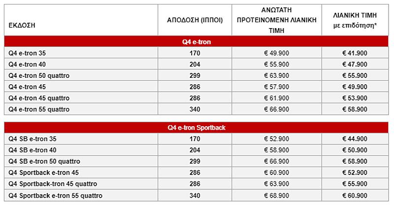 Οι νέες εκδόσεις του Audi Q4 e-tron έχουν ακόμα πιο πλούσιο βασικό εξοπλισμό και όλη η γκάμα διατίθεται σε ιδιαίτερα ανταγωνιστικές τιμές, που με την επιδότηση του προγράμματος «Κινούμαι Ηλέκτρικά 2» διαμορφώνονται ως εξής: