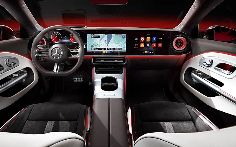 Το κυριότερο χαρακτηριστικό του εσωτερικού είναι η ανεξάρτητη διπλή οθόνη, που περιλαμβάνει πλέον μία οθόνη 7 ιντσών και μία 10,25 ιντσών στον βασικό εξοπλισμό. Προαιρετικά είναι διαθέσιμες δύο ευρείες οθόνες 10,25 ιντσών, οι οποίες προσφέρουν μια υπερσύγχρονη ψηφιακή εμπειρία και δημιουργούν μια πολύ ευρύχωρη διαρρύθμιση του χώρου. Το τιμόνι της τρέχουσας γενιάς επενδύεται με δέρμα νάπα ως βασικός εξοπλισμός. Εναλλακτικά, το σπορ τιμόνι πολλαπλών λειτουργιών διατίθεται για πρώτη φορά με επένδυση συνθετικού δέρματος ARTICO. Τα νέα στοιχεία διάκοσμου σε εμφάνιση σκούρων ανθρακονημάτων, καφέ ξύλο φλαμουριάς με ανοικτούς πόρους ή καφέ μικροΐνες MICROCUT (μόνο στην AMG Line) αναβαθμίζουν τον εσωτερικό χώρο. Επίσης, για πρώτη φορά διατίθεται στην AMG Line και θερμαινόμενο τιμόνι.