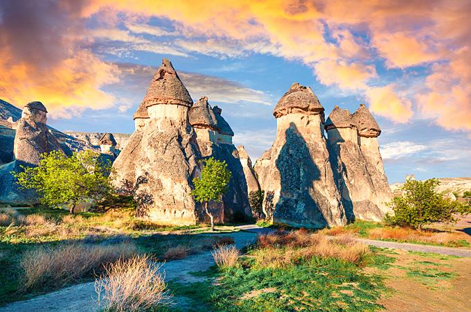 Αερόστατα που πετούν με φόντο έναν ουρανό απολύτως ροζ, τοπία ντυμένα στα πιο χρυσοκόκκινά τους, μοναδικοί βραχώδεις σχηματισμοί, υπόγειες πόλεις που επικοινωνούν μέσα από σήραγγες μήκους δεκάδων μέτρων, σπίτια λαξευμένα στους βράχους, εκκλησίες, μοναστήρια, και φανταστικά ξενοδοχεία μέσα σε σπηλιές κάνουν την Καππαδοκία ακαταμάχητη.