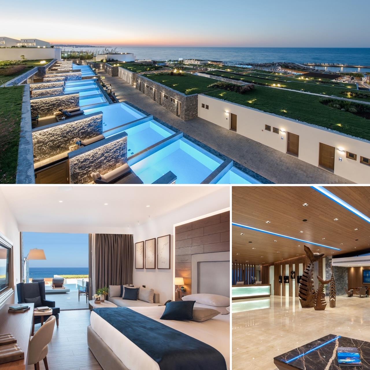 Θα αρχίσω από το ξενοδοχείο, λέγοντας πως έχει όλα τα στοιχεία που συνιστούν αυτό που στη σημερινή εποχή ονομάζεται ξεχωριστή εμπειρία διαμονής. Αρκετά μεγάλο σε μέγεθος (102 σουίτες και βίλλες) αλλά καθόλου ογκώδες. Η μαύρη Κρητική πέτρα κυριαρχεί και συνδυάζεται έξυπνα και κομψά με τα υπόλοιπα σύγχρονα δομικά υλικά. Τα δωμάτια είναι αμφιθεατρικά χτισμένα, όλα έχουν ανεμπόδιστη θέα στη θάλασσα, ενώ οι φυτεμένες ταράτσες δίνουν την αίσθηση ότι κάθε δωμάτιο έχει μπροστά του έναν μικρό κήπο. Η ιδιωτική πισίνα με τα άνετα sunbeds, καθώς και το γεγονός πως δεν μπορεί να σε δει κανείς, μεταφράζονται στην απόλυτη ιδιωτικότητα και άνεση που ψάχνει κάθε επισκέπτης. Η ευρυχωρία των δωματίων, ο ήσυχος διάκοσμος και το υψηλό επίπεδο του εξοπλισμού, ξεκινώντας από τα βασικά, όπως τα κρεβάτια, τα μαξιλάρια και τα κλινοσκεπάσματα και πηγαίνοντας προς τις μικρές ή μεγαλύτερες εκπλήξεις, όπως τα καλλυντικά Hermès, η χρωματοθεραπεία και η οθόνη αφής στον καθρέφτη του μπάνιου, κάνουν τη διαμονή αξέχαστη. Όλα αυτά αφορούν και την πιο «απλή» πρόταση διαμονής, ενώ οι βίλλες με δυνατότητα φιλοξενίας πολλών ατόμων προσφέρουν μια σειρά ακόμα πιο ιδιαίτερου εξοπλισμού και tailor made υπηρεσιών.