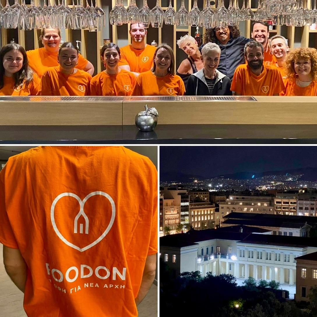 Η εμπειρία μου δεν τελείωσε όμως στο κομμάτι της εκπαίδευσης αλλά πήγε και πιο πέρα με την άλλη, σημαντικότατη δράση που ονομάζεται Social Dining, η οποία ήταν και η πρώτη δράση στο ξεκίνημα της FoodOn, με αξιοσημείωτα αποτελέσματα. Το σκεπτικό έχει ως εξής: Στο άλλο μισό του χώρου της οδού Ακαδημίας έχει στηθεί ένα εστιατόριο 50 θέσεων, με καταπληκτική θέα στη φωτισμένη Ακρόπολη και την πόλη, όπου σε τακτά χρονικά διαστήματα οργανώνονται δείπνα που τα ονομάζω δείπνα αγάπης. Ένας, δύο ή και περισσότεροι σεφ, διαφορετικοί κάθε φορά, ετοιμάζουν ένα δείπνο με τη βοήθεια μιας ομάδας από εθελοντές και σπουδαστές. Πελάτης μπορεί να είναι ο καθένας, αυτός που έχει τη δυνατότητα να πληρώσει για ένα γεύμα έξω από το σπίτι του σε ένα συμβατικό εστιατόριο. Στην -εξαιρετικά καλή - τιμή των € 35 περιλαμβάνεται και το κόστος συμμετοχής ενός ωφελούμενου ο οποίος έχει υποδειχθεί από τις κοινωνικές υπηρεσίες. Οι συνδαιτυμόνες δεν γνωρίζονται μεταξύ τους. Ακόμα κι αν εγώ πάω με την παρέα μου δεν θα καθίσουμε μαζί παρά θα ανακατευθούμε για να μοιραστούμε το φαγητό μας γύρω από ένα τραπέζι δίνοντας χαρά ο ένας στον άλλον, χωρίς να ξέρουμε τίποτα για τη ζωή ο ένας του άλλου, παρά μόνον όσα φέρει η κουβέντα κι όσα θέλουμε να βγάλουμε προς τα έξω. Αυτό που - μηχανικά σχεδόν - λέμε, ότι το φαγητό ενώνει τους ανθρώπους, βρίσκει εδώ την πρωταρχική του σημασία, κι αυτό είναι το σπουδαίο με τα δείπνα της FoodOn.