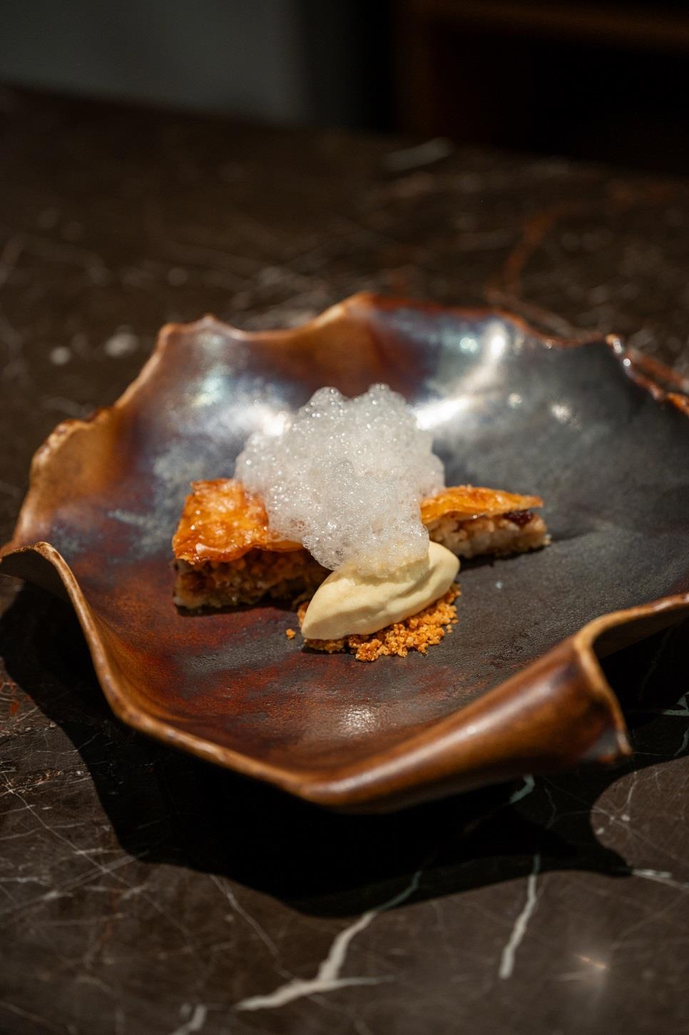 Γλυκιά ρυζόπιτα, όχι μόνο δεν είχα ξαναφάει στη ζωή μου, ούτε καν την ύπαρξή της γνώριζα. Είναι μια πίτα νηστίσιμη με ρύζι, σταφίδες, καρύδια και ζεστά μπαχαρικά. Στην εκδοχή της βραδιάς το γλυκό συνοδεύτηκε από παγωτό μελιού και αφρό παλαιωμένης γραβιέρας. Ένα ποίημα που θα θυμάμαι.