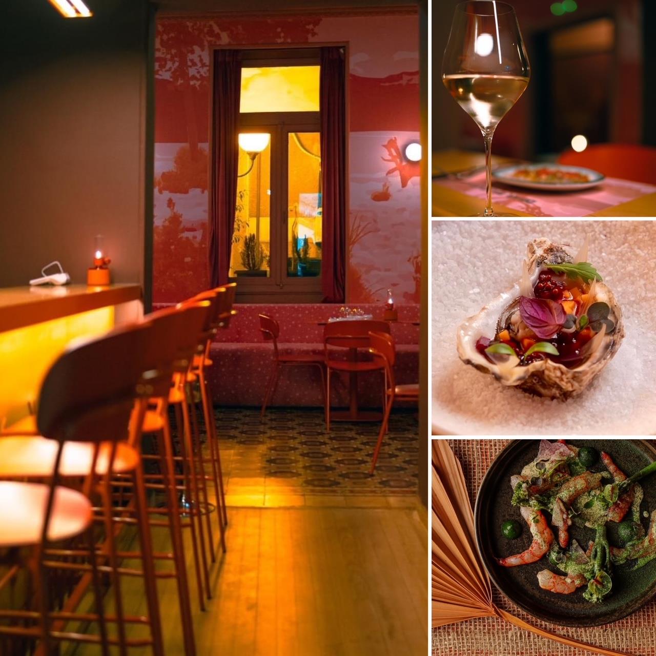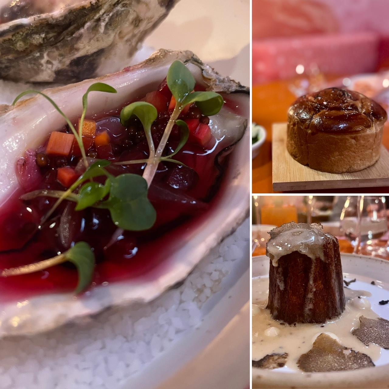 Η από τη φύση της αισθησιακή γεύση και υφή του στρειδιού ενισχύεται από το κατακόκκινο έξτρα umami ζουμί και το σαλατάκι από πίκλες. Το πιο-αφράτο-δεν υπάρχει milkbread έχει γλασαριστεί από σάλτσα στιφάδου και μετά βίας κρατιέσαι να μην το φας όλο. Οι γαρίδες έχουν μείνει ωμές και συνδυάζονται εξαιρετικά ευρηματικά με μπροκολίνι, φίνο αλλαντικό coppa από την Πάρμα της Ιταλίας και σος που παραπέμπει στην καρμπονάρα. Τα ντελικάτα χτένια σερβίρονται σε διάφανο ζωμό από σελινόριζα και μικρά καρέ από μοσχαρίσια γλώσσα και λαδοτύρι‧ άλλος ένας ευφυής, νόστιμος συνδυασμός.