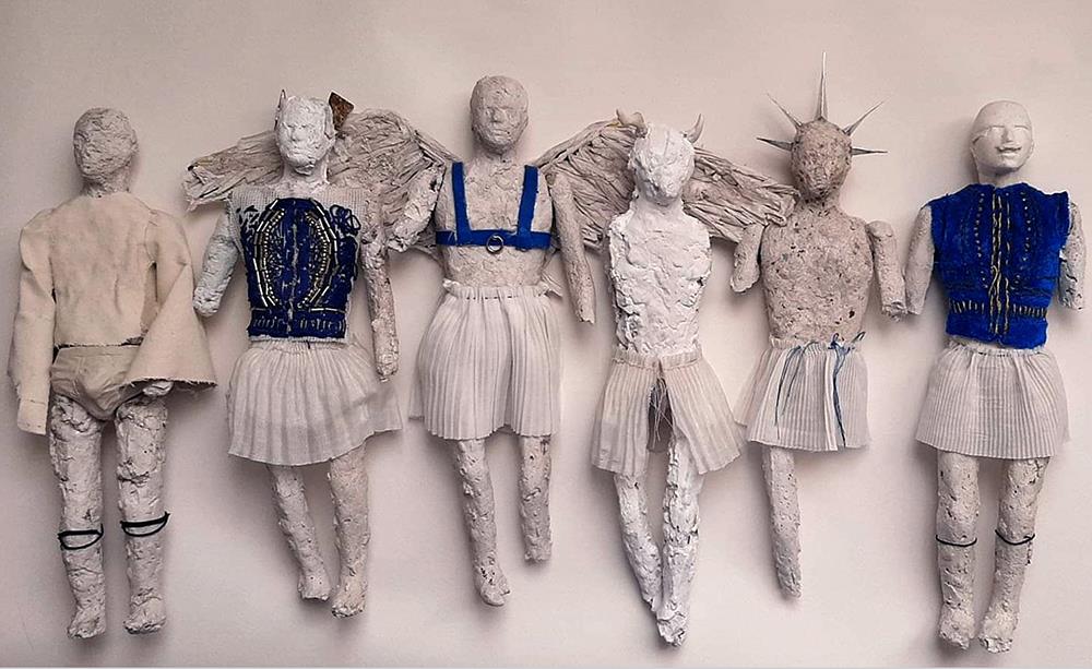 Ακρίτες και εύζωνες, σκιέρ και ορειβάτες, ναυτάκια και στρατιώτες, θεοί και δαίμονες, θεριστές, ποδοσφαιριστές, κερασφόροι και αρχαία νευρόσπαστα, συνομιλούν με χταπόδια, τσαρούχια, καράβια και πολύχρωμους παπαγάλους, επινοώντας μια νέα πλαστική ρυθμολογία και πλέοντας σε ένα ευκίνητο σύμπαν προσωπικής μυθοπλασίας κα επινόησης.