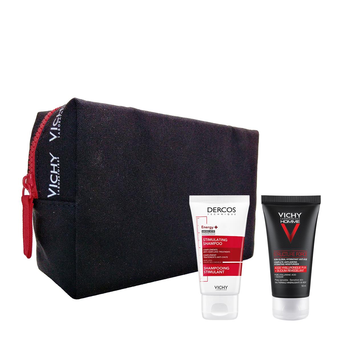 Τα Χριστούγεννα γίνονται μαγικά και για τους άνδρες, με τα μαύρα Xmas Pouches της Vichy, στα οποία μπορείτε να βρείτε την Structure Force, την αντιρυτιδική κρέμα ημέρας για άνδρες, που παρέχει 24ωρη ενυδάτωση και δρα ενάντια στα σημάδια γήρανσης της ανδρικής επιδερμίδας, όπως την απώλεια σφριγηλότητας, τις ρυτίδες γύρω από τα μάτια, την υφή της επιδερμίδας και τη χαλάρωση. Τα μαύρα Xmas pouches, συνοδεύονται από το δυναμωτικό σαμπουάν της σειράς Dercos, Dercos Energy +, που είναι κατάλληλο για ευαίσθητο τριχωτό και μειώνει την τριχόπτωση, ενισχύοντας την τρίχα και το τριχωτό.