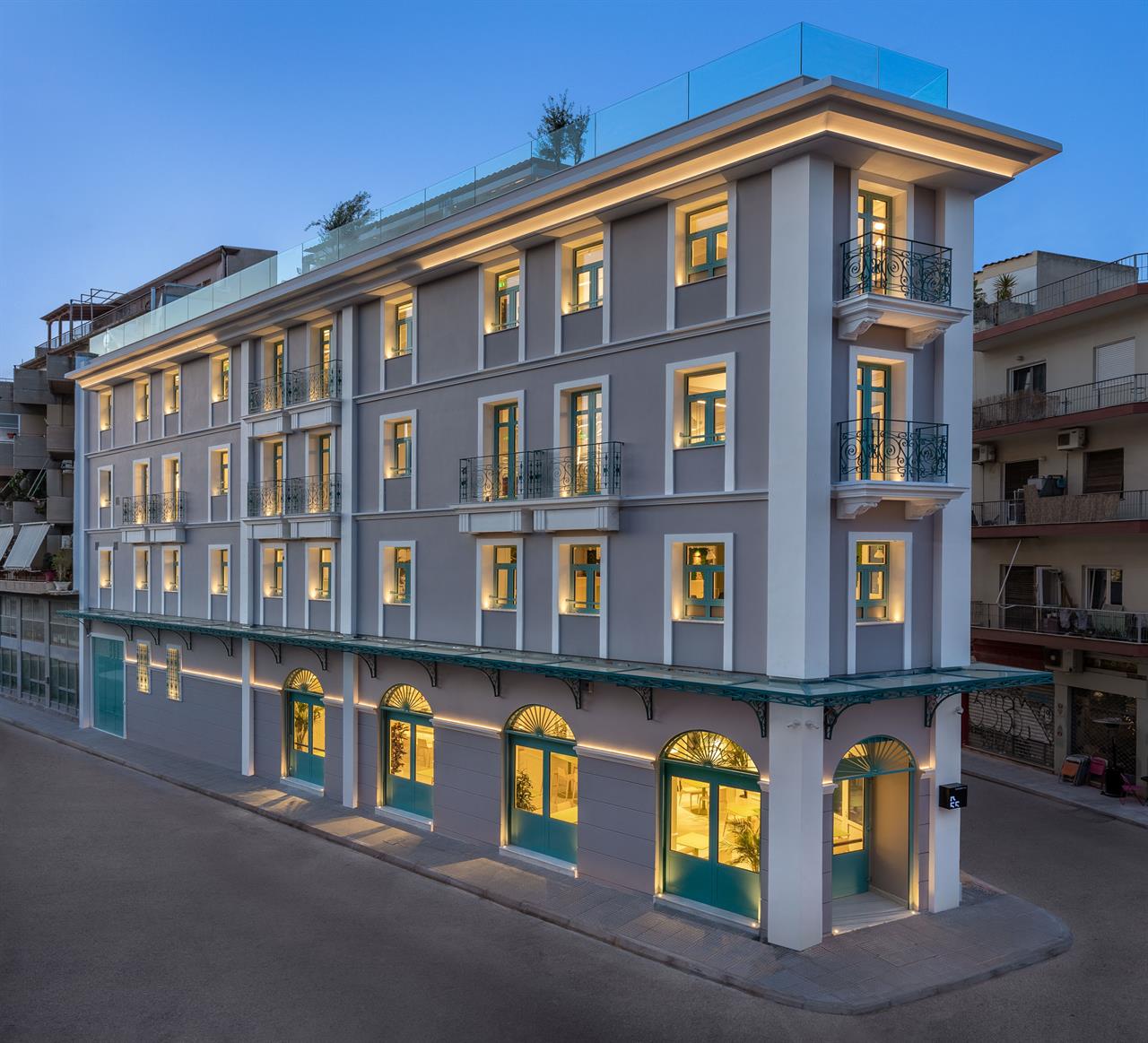 Είναι που δεν έχεις πάρει ακόμα το ασανσέρ να ανέβεις στον τέταρτο όροφο, και να πιάσεις ένα από τα τραπεζάκια στην ταράτσα, που είναι διαμορφωμένη σαν κουλ μπαράκι με ελιές και άλλα μικρά δεντράκια που φωτίζονται τα βράδια αριστοτεχνικά. Από εδώ, η θέα στην Ακρόπολη είναι φαντασμαγορική, ειδικά την ώρα του ηλιοβασιλέματος που βάφει χρυσοκόκκινα τα νερά της μικρής πισίνας στην άκρη της ταράτσας (διακοσμητική είναι, σε βλέπουμε που ονειρεύεσαι βουτιές μες στο καταχείμωνο). Αν ωστόσο πετύχεις χειμωνιάτικη λιακάδα, κανείς και τίποτα δεν σε εμποδίζει να πάρεις το λάπτοπ σου και να κάτσεις να δουλέψεις εδώ, χαζεύοντας την Ακρόπολη από τη μία και το μεγαλειώδες χάος της Αθήνας από την άλλη.