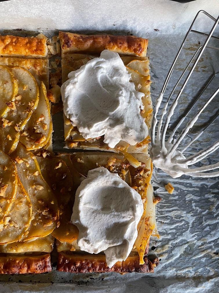 Σερβίρουμε την τάρτα χλιαρή και συνοδεύουμε, προαιρετικά, με χτυπημένη κρέμα σε ελαφριά chantilly, χωρίς ζάχαρη για μένα, αρωματισμένη με κανέλα ή, εναλλακτικά, με παγωτό βανίλια. Για να πετύχουμε τη chantilly πρέπει η κρέμα να είναι πλήρης σε λιπαρά και να είναι πολύ παγωμένη. Παγωμένα, επίσης, πρέπει να είναι και τα εργαλεία δηλ. ο κάδος του μίξερ και το σύρμα. Αρχίζουμε να χτυπάμε σε μέτρια ταχύτητα και δυναμώνουμε σε μέτρια προς δυνατή όταν η κρέμα αρχίσει να πήζει. Προσέχουμε να μην το παρακάνουμε γιατί γρήγορα η κρέμα κόβει. Αν βάλουμε ζάχαρη, αυτή θα πρέπει να είναι άχνη και η στιγμή να την προσθέσουμε είναι μόλις η κρέμα αρχίσει να πήζει, πριν δυναμώσουμε την ταχύτητα. Η ποσότητα της ζάχαρης είναι προσωπικό θέμα, όμως σίγουρα δεν πρέπει να υπερβάλλουμε. Οι περισσότερες συνταγές συστήνουν 10 γρ. ζάχαρη ανά 100 ml κρέμας.