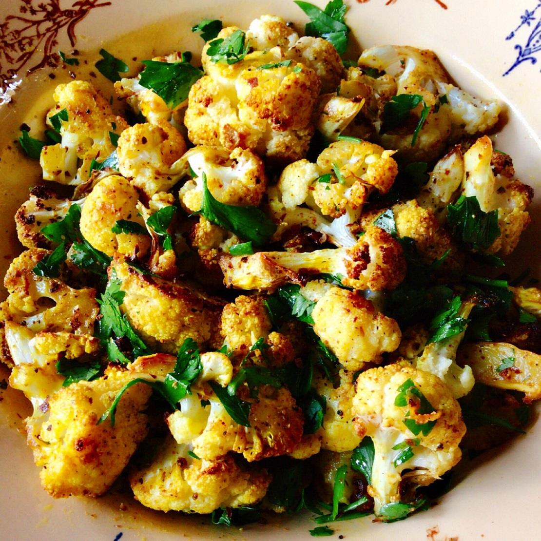 Για 4 άτομα ως συνοδευτικό. Προθερμαίνουμε τον φούρνο στους 180ο C στη λειτουργία του αέρα. Πλένουμε δύο μικρά κουνουπίδια ή ένα μεγάλο, αφαιρούμε τα φύλλα και το κάτω σκληρό μέρος των κοτσανιών και χωρίζουμε τα “μπουκετάκια”. Τα αραδιάζουμε στη λαμαρίνα του φούρνου που έχουμε στρώσει με αντικολλητικό χαρτί, τα αλείφουμε με λίγο εξαιρετικό παρθένο ελαιόλαδο (όχι παραπάνω από 2 κ.σ.) και τα πασπαλίζουμε με χοντρό θαλασσινό αλάτι, χοντροτριμμένο μαύρο πιπέρι ή ποικιλία πιπεριών, κύμινο, κουρκουμά, καπνιστή πάπρικα και λίγο μπούκοβο. Ανακατεύουμε με τα χέρια μας για να κολλήσουν τα μπαχαρικά παντού. Ψήνουμε για περίπου 25΄-30΄, μέχρι τα μπουκετάκια του κουνουπιδιού να «αρπάξουν» κατά τόπους και να τρυπιούνται, παραμένοντας όμως σχετικά τραγανά. Πασπαλίζουμε με ψιλοκομμένο μαϊντανό και σερβίρουμε χλιαρά ή σε θερμοκρασία δωματίου, αφού τα περιχύσουμε με λίγο ωμό ελαιόλαδο.