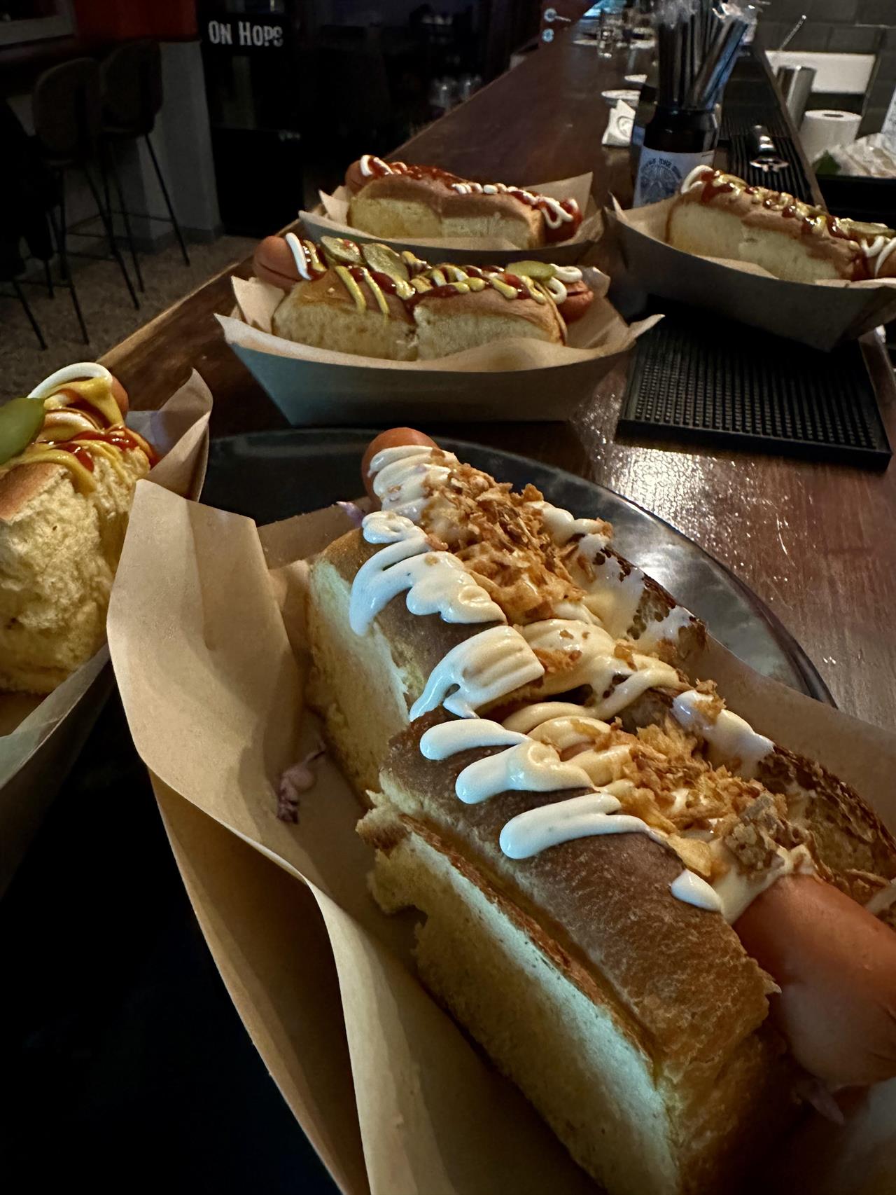 Hot Dog και μπίρες ταιριάζουν τέλεια και το μπιράδικο του Αμαρουσίου το ξέρει πολύ καλά. Έτσι έχει βάλει στον κατάλογό του επιλογές όπως το Ολ Τάιμ Κλάσικ με μπριός, κέτσαπ, μουστάρδα μαγιονέζα και πίκλες, το Χου Λετ Δε Ντογκς άουτ με μπριος, σάλτσα αϊολί, sweet chilli mayo, τηγανιτό κρεμμύδι και coleslaw και το Τέικ Ίτ Τσίζι με σάλτσα BBQ, Τσένταρ, iceberg, pico de gallo και τηγανιτό κρεμμύδι. Οι τιμές τους από 4,5€.