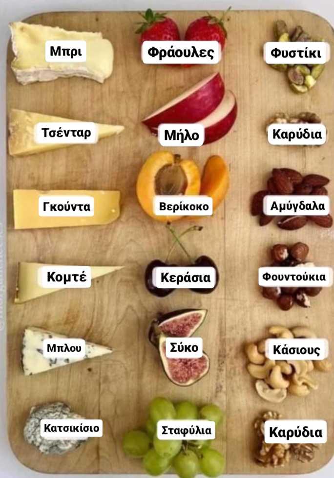 Τυριά, φρούτα και ξηροί καρποί, σε ένα εύχρηστο σχεδιάγραμμα για να ξέρεις τι συνδυάζεται με τι και να καταπλήξεις τα πλήθη με τις τυρο-ποικιλίες σου.