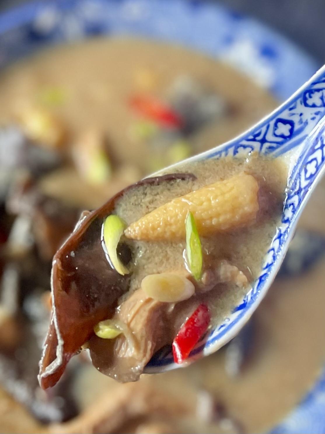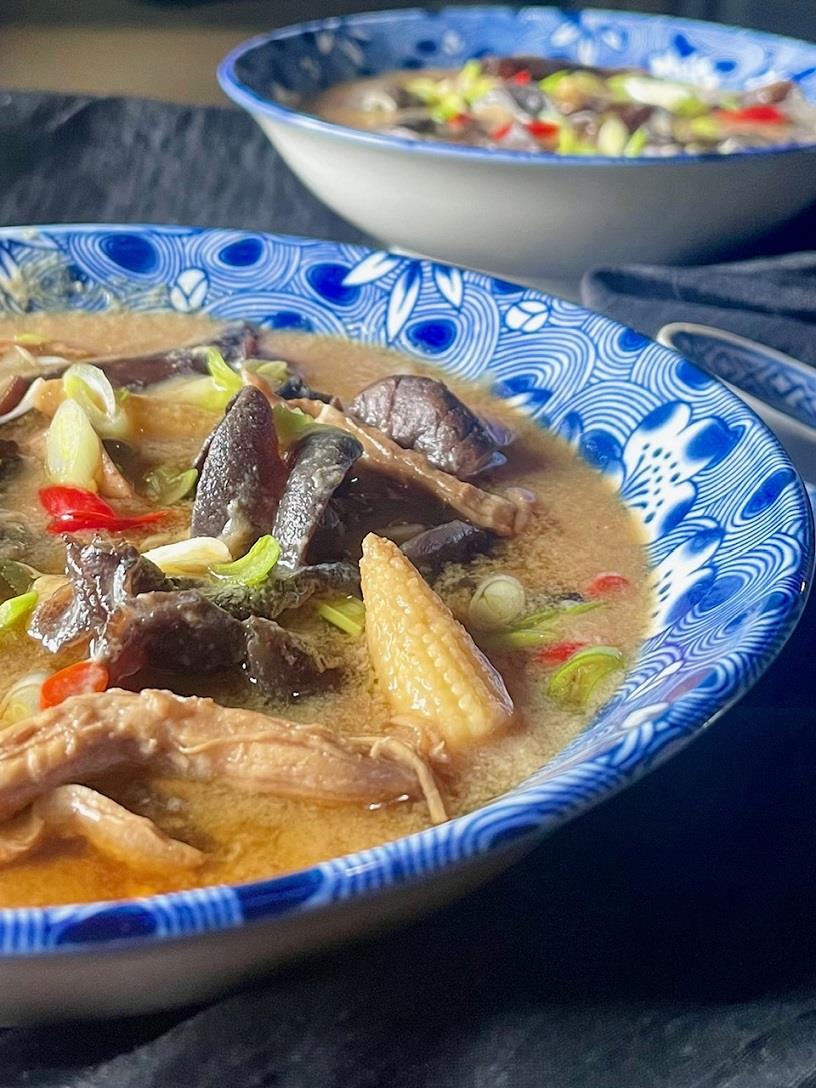 Αφού μουλιάσουμε τα αποξηραμένα μανιτάρια σε άφθονο ζεστό νερό για περίπου 30΄, τα σουρώνουμε και κρατάμε 0,5 λίτρο υγρό. Το βάζουμε στην κατσαρόλα, προσθέτουμε τον ζωμό, το ginger, το sesame oil, τα πιπέρια, τη ζάχαρη και τη soy sauce και φέρνουμε σε βρασμό. Προσθέτουμε το κοτόπουλο, χαμηλώνουμε τη φωτιά και βράζουμε μέχρι να μαγειρευτεί το κοτόπουλο μέχρι μέσα. Το αφαιρούμε από την κατσαρόλα και μόλις χλιάνει το διαλύουμε σε λωρίδες με τα χέρια μας. Το ξαναβάζουμε στο σκεύος και προσθέτουμε τα μανιτάρια που έχουμε κόψει σε κομμάτια και το μπαμπού ή τα καλαμπόκια, καθώς και το tofu, εάν βάλουμε. Προσθέτουμε το μίγμα νερού/corn flour σε αργή ροή, ανακατεύοντας συνέχεια για να μην κάνει σβώλους. Μόλις η σούπα πήξει απομακρύνουμε την κατσαρόλα από τη φωτιά και προσθέτουμε το ξύδι. Ανακατεύουμε και δοκιμάζουμε. Διορθώνουμε, εάν χρειαστεί. Τέλος, προσθέτουμε σε αργή ροή τα χτυπημένα αυγά και ανακατεύουμε με chopsticks ή καλαμάκια για σουβλάκι για να σχηματίσουν κορδέλες καθώς θα πέφτουν μέσα στη σούπα. Τα αυγά θα ψηθούν από τη θερμότητα της σούπας. Μοιράζουμε σε μπολ και γαρνίρουμε με τα φρέσκα κρεμμυδάκια. Απολαμβάνουμε τη σούπα καυτή.