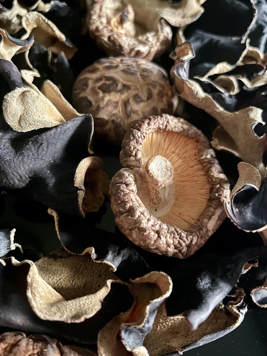 1) Δύο γεμάτες χούφτες αποξηραμένα μανιτάρια: Παραδοσιακά στη σούπα μπαίνουν shiitake και wood ear (όπως αυτά στην πιο πάνω φωτογραφία). Shiitake βρίσκουμε αρκετά εύκολα, αλλά για τα wood ear θα χρειαστεί να απευθυνθούμε σε ασιατικά καταστήματα. Και τα δύο αυτά είδη μανιταριών έχουν έντονο άρωμα, βαθιά γεύση και αρκετά μαστιχωτό δάγκωμα, κυρίως τα wood ear. Παρόλα αυτά, μην διστάσετε να βάλετε ό,τι είδος θέλετε, ακόμα και νωπά.