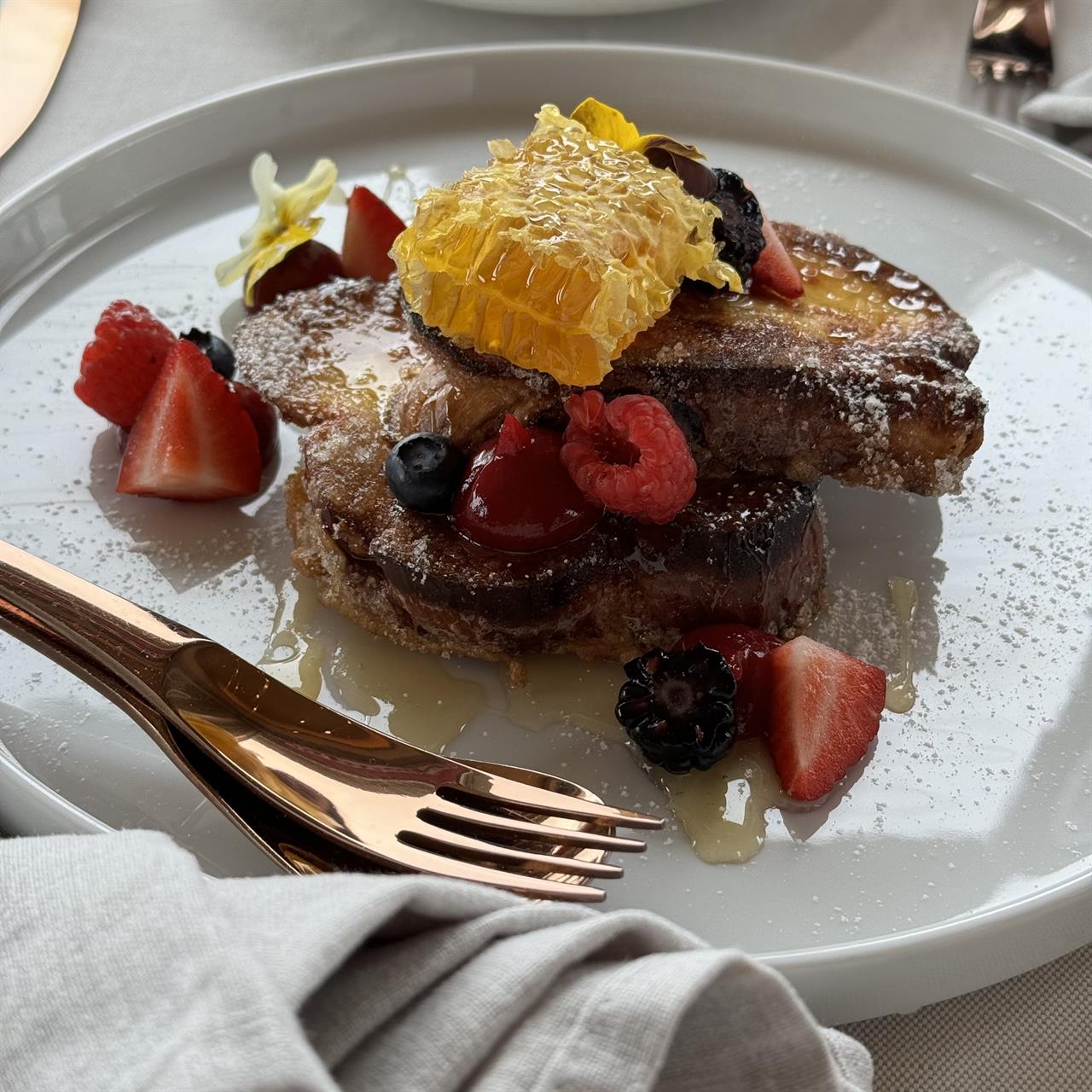 Η πραγματική αποκάλυψη όμως είναι το μενού του executive chef Μπάμπη Κουντούρη, που εμπνέεται από την ελληνική παράδοση, τα υλικά και τα αρώματα, τα οποία εμβαπτίζει στη φιλοσοφία του brunch, όχι όμως με τον αναμενόμενο, πολυφορεμένο τρόπο «καγιανάς αντί για scrambled eggs». Πάρε για παράδειγμα το French Toast του: Καραμελωμένο παραδοσιακό τσουρέκι στη βάση, βατόμουρα και φράουλες στη μέση, και μια ολόκληρη κηρήθρα μελιού στην κορυφή, η οποία λούζει με κάθε ζούληγμα το σύνολο σε ένα μέλι βαθιά ελληνικό.