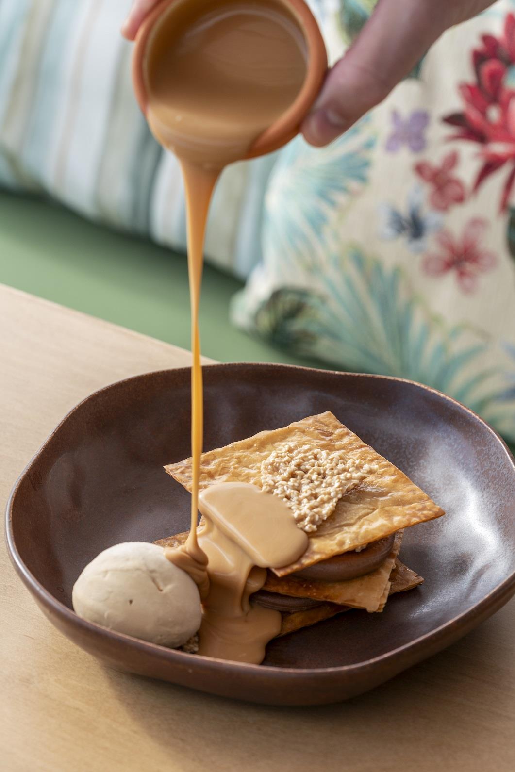 Κάθε ψαροταβέρνα που σέβεται τον εαυτό της οφείλει να δώσει σημασία και στα επιδόρπια. Ο Αργύρης Πόπτσιος, μόνιμος συνεργάτης του Άγγελου Μπακόπουλου, τα έχει φροντίσει με την ίδια προσοχή και γράφει τον τέλειο επίλογο του θαλασσινού γεύματος. Βλέποντας, πριν το γευτώ, το πλούσιο γλυκό που ήρθε στο τραπέζι (καραμελωμένο φύλλο με ταχίνι, ganache από σοκολάτα γάλακτος, παστέλι, παγωτό αλμυρής καραμέλας και σος από καραμέλα βουτύρου) και με δεδομένο ότι δεν αγαπώ καθόλου ούτε το ταχίνι στα επιδόρπια, ούτε τη σοκολάτα γάλακτος, δεν μπορούσα ποτέ να φανταστώ όχι μόνο πως δεν θα με λίγωνε, αλλά ότι θα το τελείωνα σχεδόν μόνη μου. Εδώ ταιριάζει το ποτέ μην λες ποτέ! Άλλο επικό γλυκό είναι η καμένη γαλατόπιτα, σαν crème brulée στο ελληνικό της, με σιρόπι μελιού/περγαμόντου και παγωτό καϊμάκι.