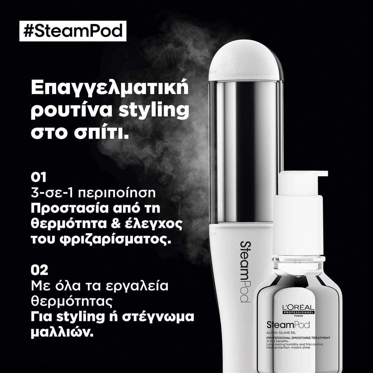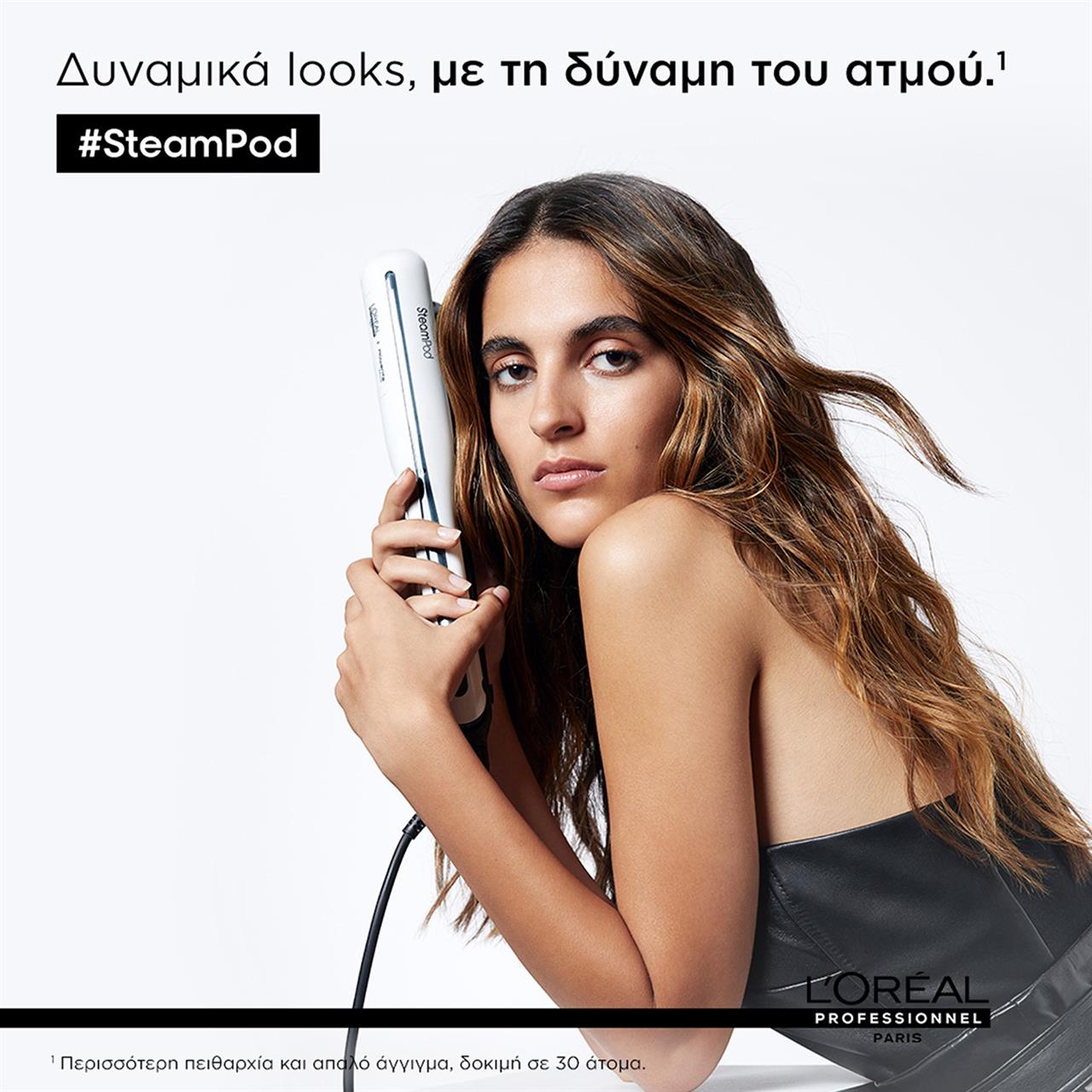 Εργαλείο για μπούκλες: Δημιουργεί κυματιστά ή σγουρά μαλλιά. Το SteamPod 4.0 της L'Oréal Professionnel είναι το πρώτο επαγγελματικό styler για μπούκλες και ίσιωμα μαλλιών με την πατενταρισμένη τεχνολογία ατμού. Δίνει looks με μεγαλύτερη διάρκεια, πιο καλοσχηματισμένες μπούκλες, περισσότερη πειθαρχία με 95% λιγότερη φθορά.