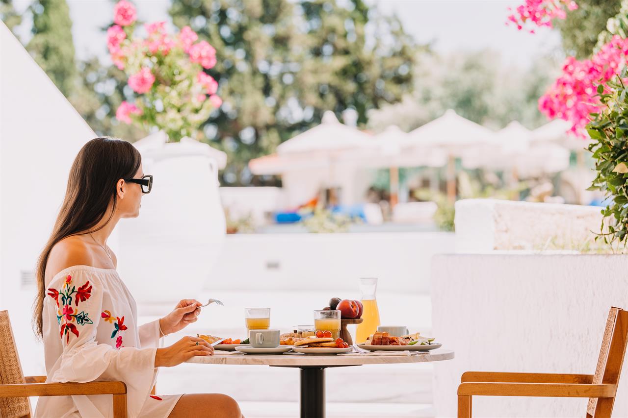 Και με το δίκιο σας. O μπουφές που στήνεται εδώ τρεις φορές την ημέρα είναι λόγος από μόνος του να κλείσει κανείς ένα long weekend στην Εύβοια. Θα ξεκινήσουμε από το πρωινό, που σερβίρεται ως τις 11.00 όπως πρέπει επειδή και οι υπναράδες έχουμε ψυχή, και περιλαμβάνει αυγά σε κάθε πιθανή και απίθανη εκδοχή, από ομελέτες φούρνου με μπέικον ή χωρίς μέχρι την παραδοσιακή ισραηλινή συνταγή που λέγεται σακσούκα και είναι αυγά ποσέ λουσμένα σε μια κολασμένη, πικάντικη σάλτσα ντομάτας. Δεν τελειώνει, βέβαια, εδώ: Πολλά διαφορετικά είδη τυριών και αλλαντικών, φρεσκοφουρνιστά κρουασάν βουτύρου ή σοκολάτας, μπουγάτσα λουσμένη στην κανέλα, χειροποίητα pancakes με μέλι ή μερέντα, φρέσκο παραδοσιακό γιαούρτι και δεκάδες εκδοχές φρούτων και καρπών για να το συνοδεύσεις είναι μερικά από τα χαϊλάητ του πρωινού μπουφέ.