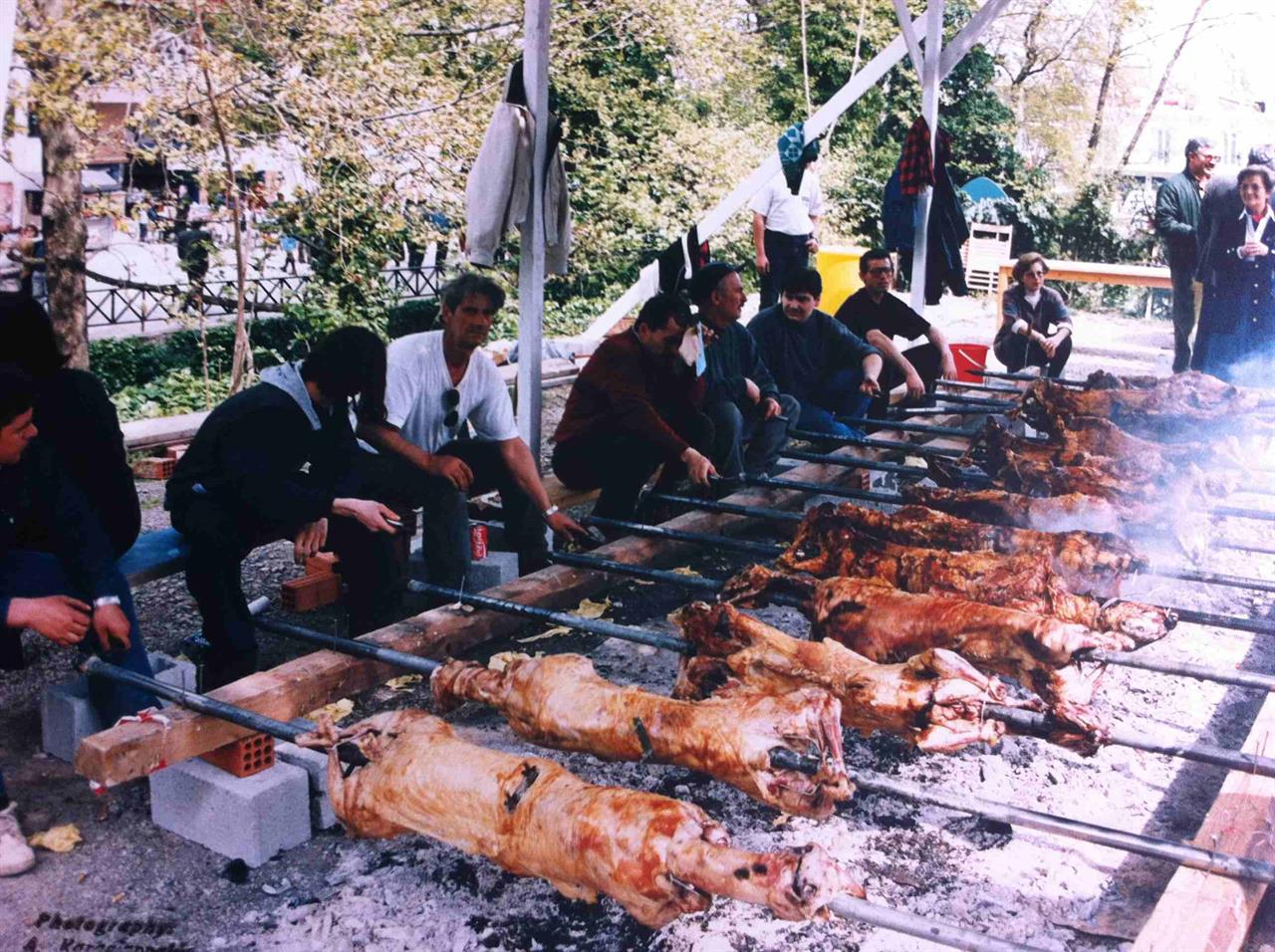 Η πόλη τυλίγεται από σύννεφα καπνού και οι μυρωδιές διαχέονται στην ατμόσφαιρα. Με ραντίσματα νερού και συχνό χτύπημα των ξύλων, ετοιμάζεται η θράκα. Όταν η θράκα είναι έτοιμη, απλώνεται για να τοποθετηθούν και να ψηθούν τα αρνιά, αλλά και το κοκορέτσι, τα κοντοσούβλια και τα συκώτια ώστε να προσφερθούν ως μεζέδες.