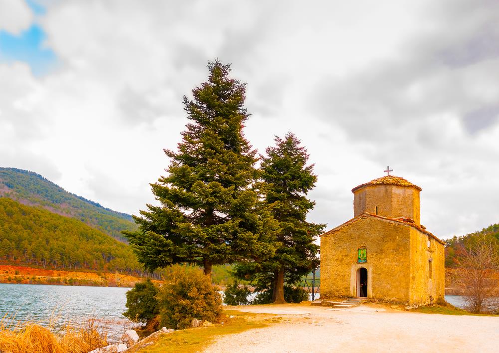 Το χιλιοφωτογραφημένο εκκλησάκι της λίμνης είναι ο Άγιος Φανούριος, άλλοτε τμήμα της μονής του Αγίου Γεωργίου η οποία βρισκόταν εδώ ως τα τέλη του 17ου αιώνα, οπότε και μεταφέρθηκε βορειοδυτικά, εκεί που βρίσκεται μέχρι σήμερα.