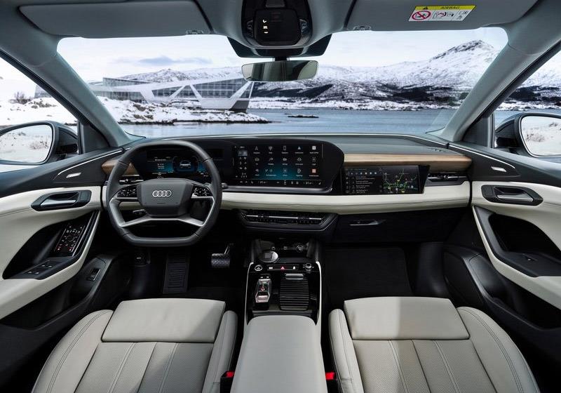 Όπως διαπιστώσαμε, το εσωτερικό είναι προσανατολισμένο στις ανάγκες των επιβατών. Η πανοραμική οθόνη Audi MMI και η οθόνη για τον συνοδηγό MMI σχηματίζουν μια ενιαία ψηφιακή σκηνή. Επιλέχθηκαν μοντέρνα χρώματα και υλικά υψηλής ποιότητας, μερικά από τα οποία ανακυκλώνονται.
