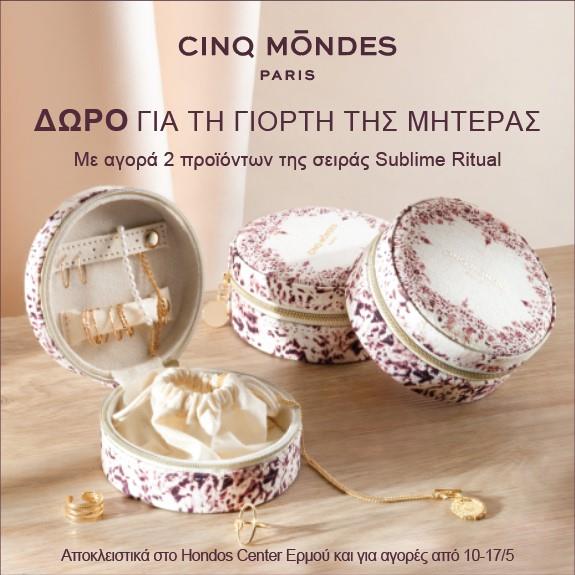 Από σήμερα Παρασκευή 10 και ως 17 Μαΐου επισκεφθείτε το νέο counter της Cinq Mondes στο Hondos Center Ερμού και αποκτήστε μία limited edition κοσμηματοθήκη με αγορά 2 προϊόντων της σειράς Sublime Ritual.
