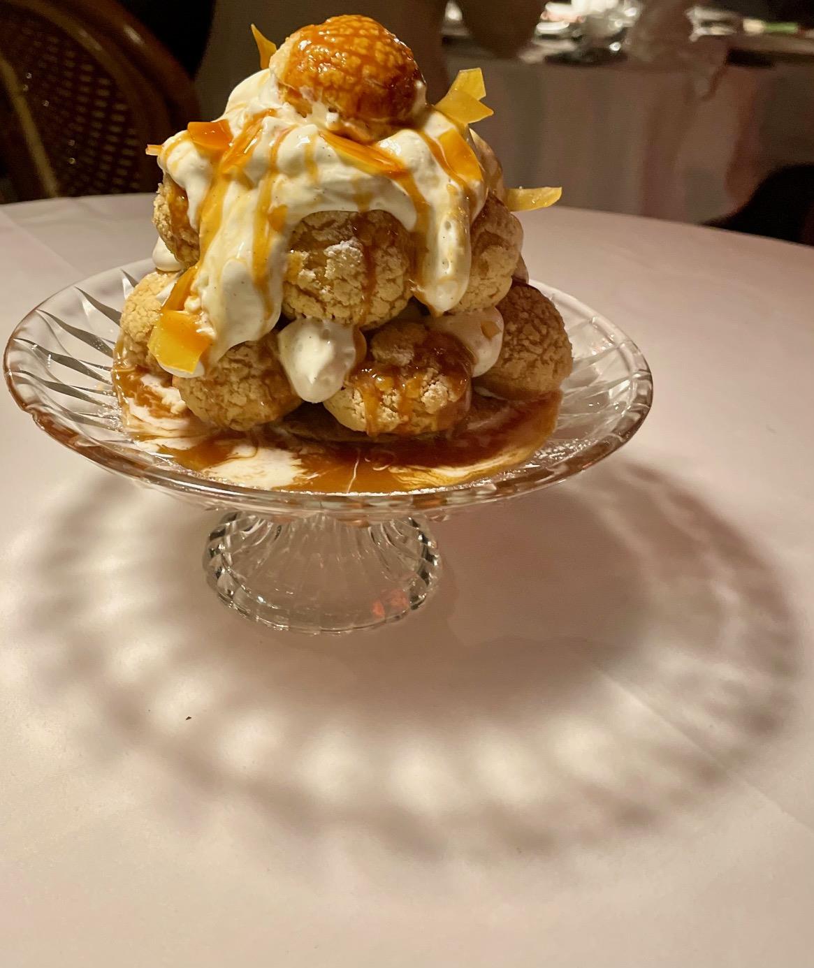 Η χαριστική βολή ήρθε με τον κάτι παραπάνω από εντυπωσιακό και λίαν αμαρτωλά νόστιμο πύργο από τα τραγανά, γεμισμένα με παγωτό, choux περιχυμένα με αλμυρή καραμέλα, έργο του pastry chef Θανάση Σταμούδη (αδελφού του Δημήτρη), που το ονομάζει croquembouche. Το όνομα προέρχεται από την ένωση των λέξεων croque-en-bouche που σημαίνουν αυτό που είναι τραγανό στο στόμα, και έτσι ονομάζεται το -παρόμοιο με κάποιες διαφορές- κλασικό γαλλικό γλυκό που σερβίρουν συχνά στους γάμους αντί για τούρτα. Αντικρύζοντάς το, αυθόρμητα αναφώνησα here’s looking at you kid!