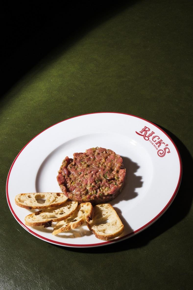 Στο ίδιο μοτίβο κινείται και το φαγητό. Ο executive chef Δημήτρης Σταμούδης έχει σχεδιάσει το μενού δίνοντας τον κύριο τόνο ενός κλασικότατου αμερικανικού steakhouse‧ άλλωστε το υποδηλώνει σαφώς και το όνομα του εστιατορίου. Στην εκτέλεση βρίσκεται ο Άγγελος Ανδριανάκης ο οποίος φροντίζει με τη μπριγάδα της κουζίνας να είναι όλα όπως πρέπει. Εδώ παρελαύνουν διάσημα πιάτα της αμερικανικής κουζίνας, όπως τα θεϊκά νόστιμα στρείδια Rockefeller (€ 8/τεμ.) γκρατιναρισμένα με βούτυρο, σπανάκι, μαϊντανό και τραγανά ψίχουλα, τα crab cakes (€ 24) όπως τα φτιάχνουν στο Maryland αλλά που στην εκδοχή του Ρικ μιλάνε και λίγα γαλλικά με τη sauce remoulade που τους πάει πολύ, οι γαρίδες κοκτέιλ (€ 17) που τις συνοδεύουν αβοκάντο, lime και κόλιανδρος σε μια πιο σύγχρονη και πιο δροσερή εκδοχή.