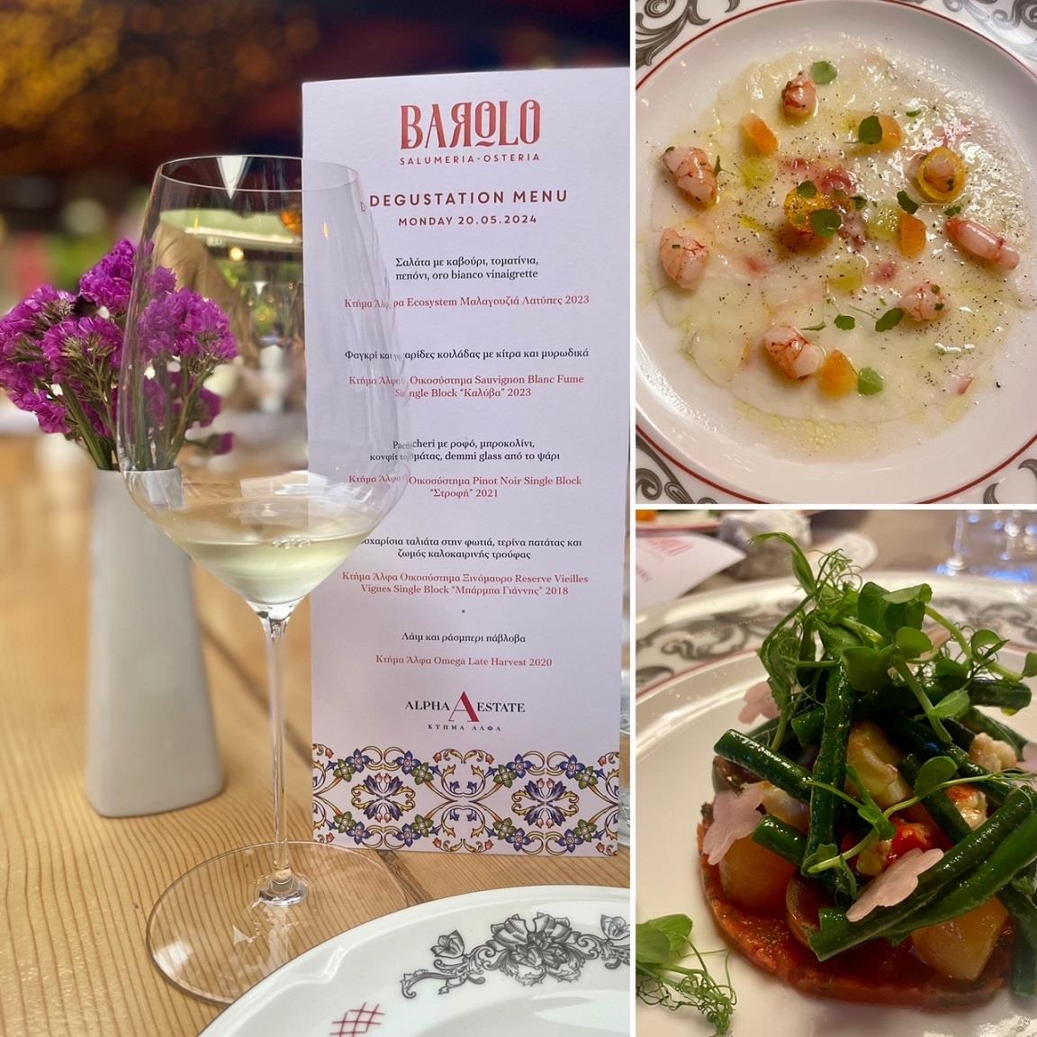 Το δείπνο ξεκίνησε με μια ολόφρεσκη σαλάτα με καβούρι, τοματίνια, πεπόνι και vinaigrette με το αρωματικότατο και φίνο λευκό μπαλσάμικο oro bianco, η οποία συνδυάστηκε με τη νέα Μαλαγουζιά του Οικοσυστήματος του Κτήματος Άλφα με την ονομασία «Λατύπες». Η συγκεκριμένη Μαλαγουζιά κυκλοφορεί σε μικρό αριθμό φιαλών και παλαιώνει για 9 μήνες σε μεγάλα βαρέλια 75hl από γαλλική δρυ και ρόμπολο.