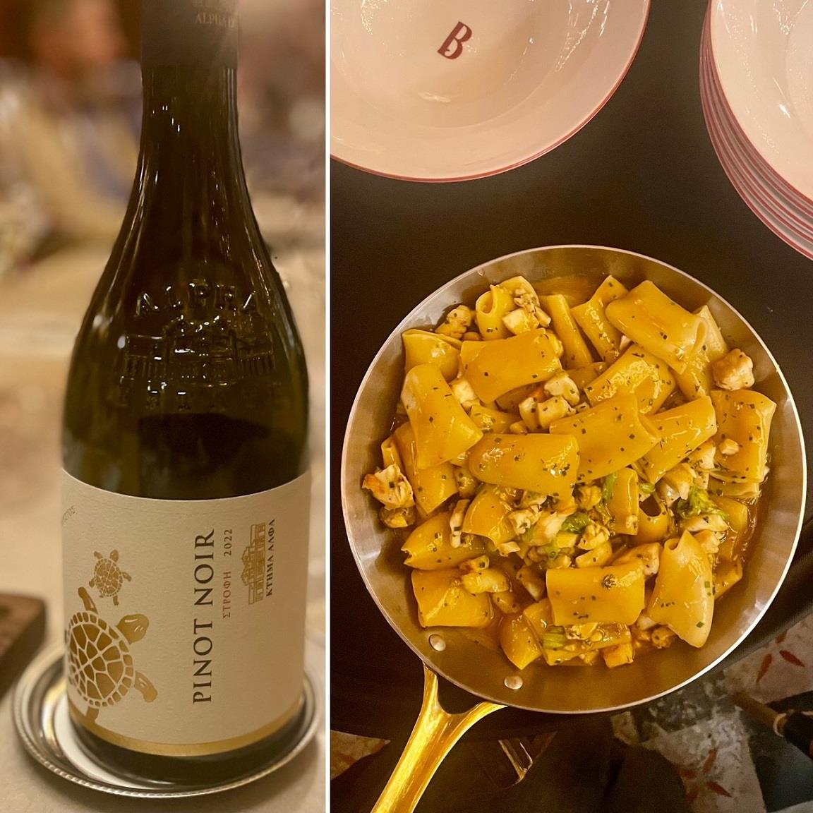 Στη συνέχεια ήρθε η ώρα για το πιάτο ζυμαρικών paccheri με ροφό, μπροκολίνι, ντομάτα κονφί και sauce demi-glace από το ίδιο το ψάρι. Τα ιδανικά σε μέγεθος και σχήμα για το συγκεκριμένο φαγητό paccheri ήταν χειροποίητα, άψογα al dente, ενώ το ίδιο άψογα μαγειρεμένο, ζουμερό και νόστιμο ήταν το φαγκρί. Το φαγητό βρήκε το τέλειο ταίρι του στο Κτήμα Άλφα Οικοσύστημα Pinot Noir Single Block "Στροφή" του 2021, ένα ελαφρύ κόκκινο κρασί με μεταξένιες τανίνες και δροσιστική οξύτητα.
