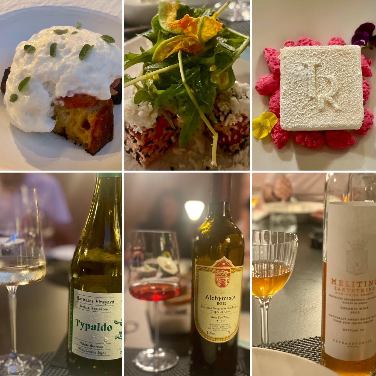 Στην ίδια ρότα κύλισε ολόκληρο το δείπνο. Η ριγανάδα, το κατ’ εξοχήν κολατσιό στο νησί, που είναι ψωμί περισσευούμενο με τριμμένη ντομάτα, ελαιόλαδο, ξύδι και την απίθανη ντόπια ονομαστή φέτα, μοσχοβολούσε από την άγρια ρίγανη. Ο αγαπημένος καλοκαιρινός συνδυασμός καρπούζι με φέτα, απέκτησε πολλαπλάσιο βάθος γεύσης και φινέτσα από το πικρούτσικο Aperol στο οποίο είχε ποτιστεί το καρπούζι και από το ρολάρισμά του σε δύο ειδών σουσάμια. Για τον μπακαλιάρο με τη σκορδαλιά, ο Ασημάκης Χανιώτης εφηύρε έναν διαφορετικό τρόπο ετοιμασίας, αντιστρέφοντας τη διαδικασία: αντί να χρησιμοποιήσει υγράλατο μπακαλιάρο και να τον ξαρμυρίσει, προτιμά το φρέσκο ψάρι, το αλατίζει για λίγη ώρα και το σερβίρει όπως είναι, χωρίς να το μαγειρέψει, με την σκορδαλιά όπως εμένα μου αρέσει, διακριτική κι ελαφριά. Ειρήσθω εν παρόδω, αυτό το πιάτο, μαζί με κάποια άλλα ελληνικά φαγητά, σερβίρεται και στο λονδρέζικο εστιατόριο, κάνοντας τους ξένους κοινωνούς της Ελληνικής γαστρονομίας. Τα τσιγαρίδια, άλλο ένα παραδοσιακό φαγητό της Κεφαλονιάς, στην ουσία ένα άκρως μυρωδάτο γιαχνί με λογιών λογιών άγρια χόρτα και βότανα, μαγειρεύτηκαν με τις σουπιές σε ένα ακόμη αλησμόνητο πιάτο. Οι αγαπημένες μάντολες που φτιάχνονται στο ίδιο το εστιατόριο, τραγανές και καθόλου υπερβολικά γλυκές, κάνουν ωραία συντροφιά με το εξαιρετικά αέρινο παρφέ γιαουρτιού.