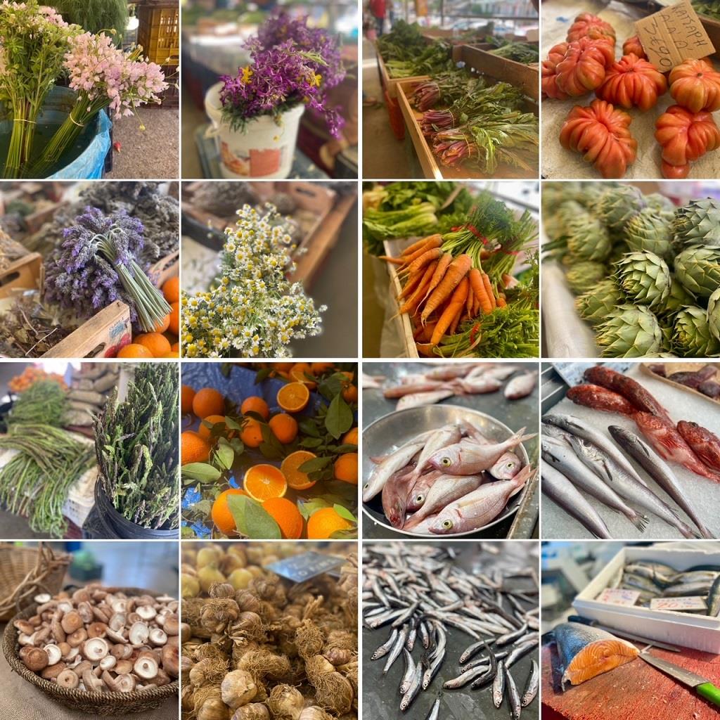Η πιο συναρπαστική βόλτα και η μεγάλη αποκάλυψη ήταν η Σαββατιάτικη λαϊκή αγορά για την οποία είχα διαβάσει πολλά, είχα μείνει άφωνη με τις φωτογραφίες, αλλά δεν είχε τύχει να πάω. Ο παράδεισος επί της γης είναι η Καλαματιανή αγορά και πώς θα μπορούσε να είναι αλλιώς σε αυτόν τον υπέροχο τόπο. Βρήκα καλούδια μοναδικά της εποχής, από άγρια χόρτα, μανιτάρια, αβρωνιές και άγριο σκόρδο με το λουλούδι του, μέχρι ψάρια και θαλασσινά, κρέας και χωριάτικα αυγά και απίθανα όμορφα αγριολούλουδα, άλλα για το βάζο κι άλλα για το πιάτο.