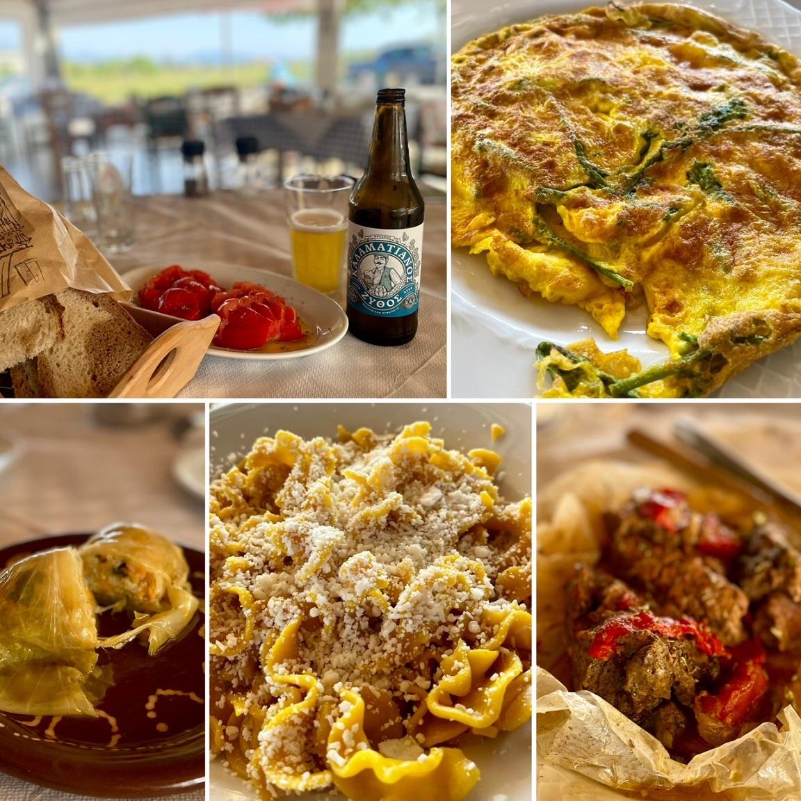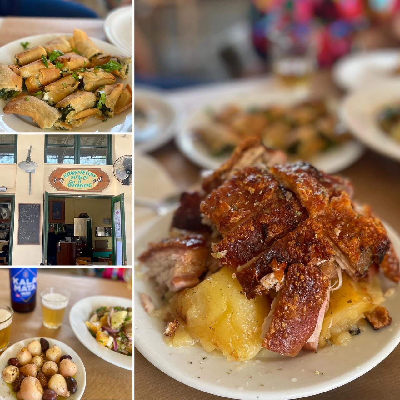 Πήγα για μεσημεριανό μεζέ στο ουζερί Θίασος όπου γεύτηκα εξαιρετικές τοπικές σπεσιαλιτέ, όπως νοστιμότατους βολβούς, τη διάσημη τοπική πατατοσαλάτα με πορτοκάλι και κρεμμύδια, μια σπανακοτυρόπιτα με σπιτικό φύλλο που κατατάσσω στα καλύτερα που έχω ποτέ δοκιμάσει και, βέβαια, τη γουρνοπούλα με την κριτσανιστή πέτσα και ψαχνό λουκούμι. Δροσίστηκα με τη ντόπια μπίρα, μια πολύ νόστιμη απαστερίωτη και αφιλτράριστη lager.